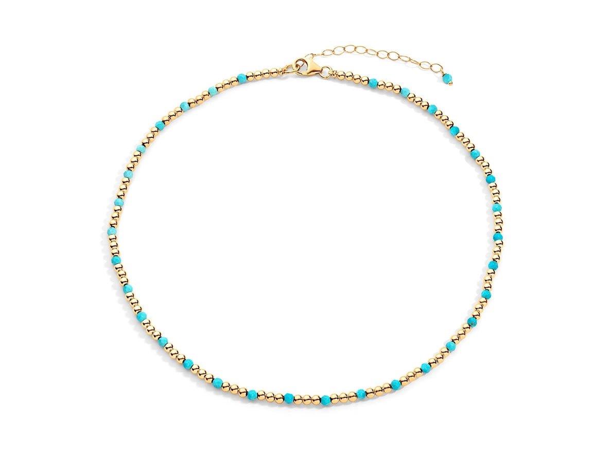 Turquoise beads highlight this handmade necklace of 3mm 14k gold-filled beads. Adjustable from 14.5 to 16.5 inches. Tarnish resistant and crafted for everyday wear— swim, sweat, and sleep in it without worry.