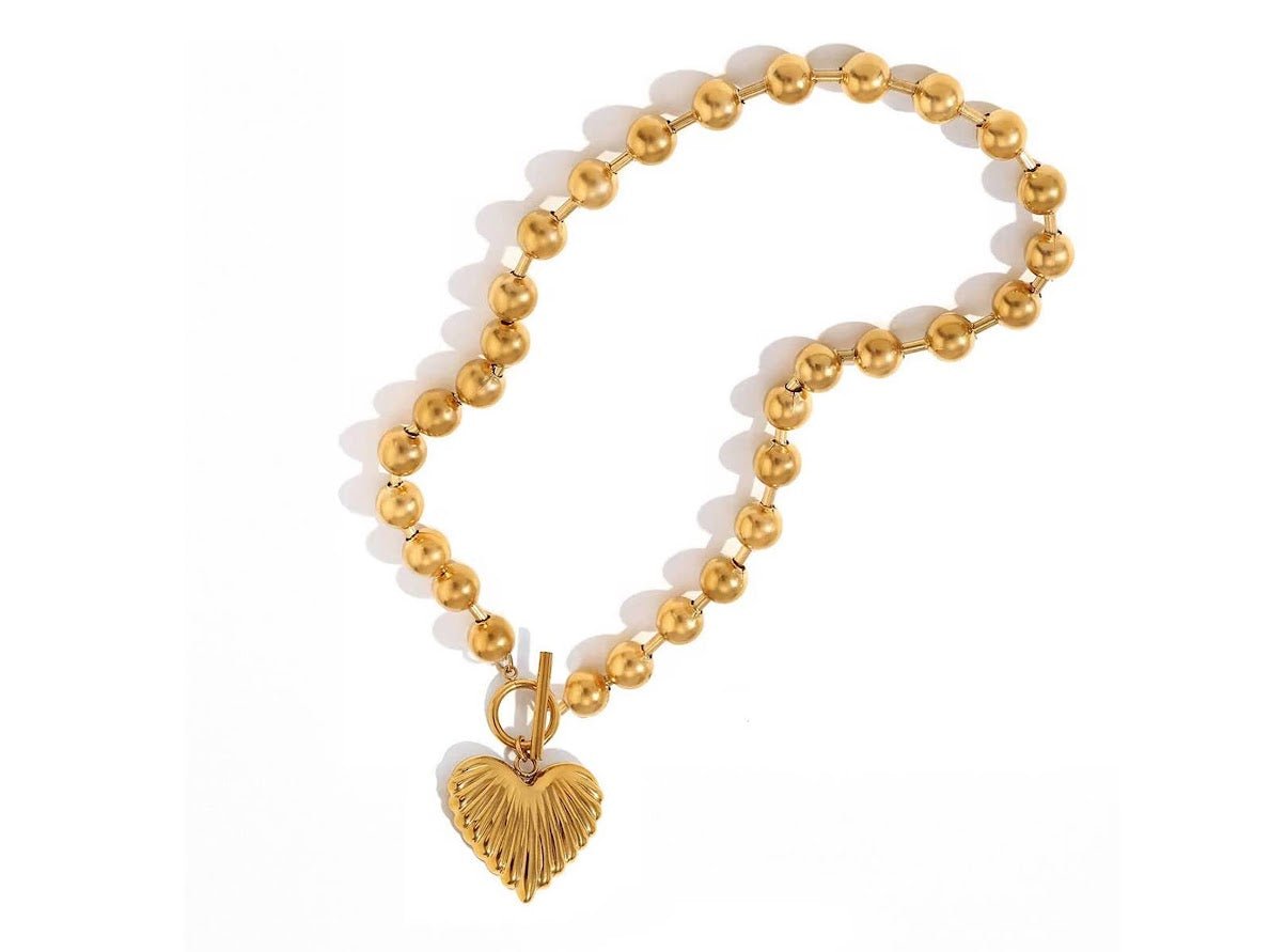 Made of 18k gold over stainless steel, this necklace consists of a 19-inch ball chain and a rayed, art deco-inspired heart charm. Resistent to water, sweat, and heat. Hypoallergenic.