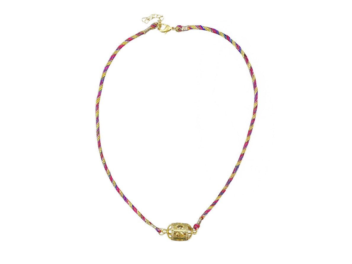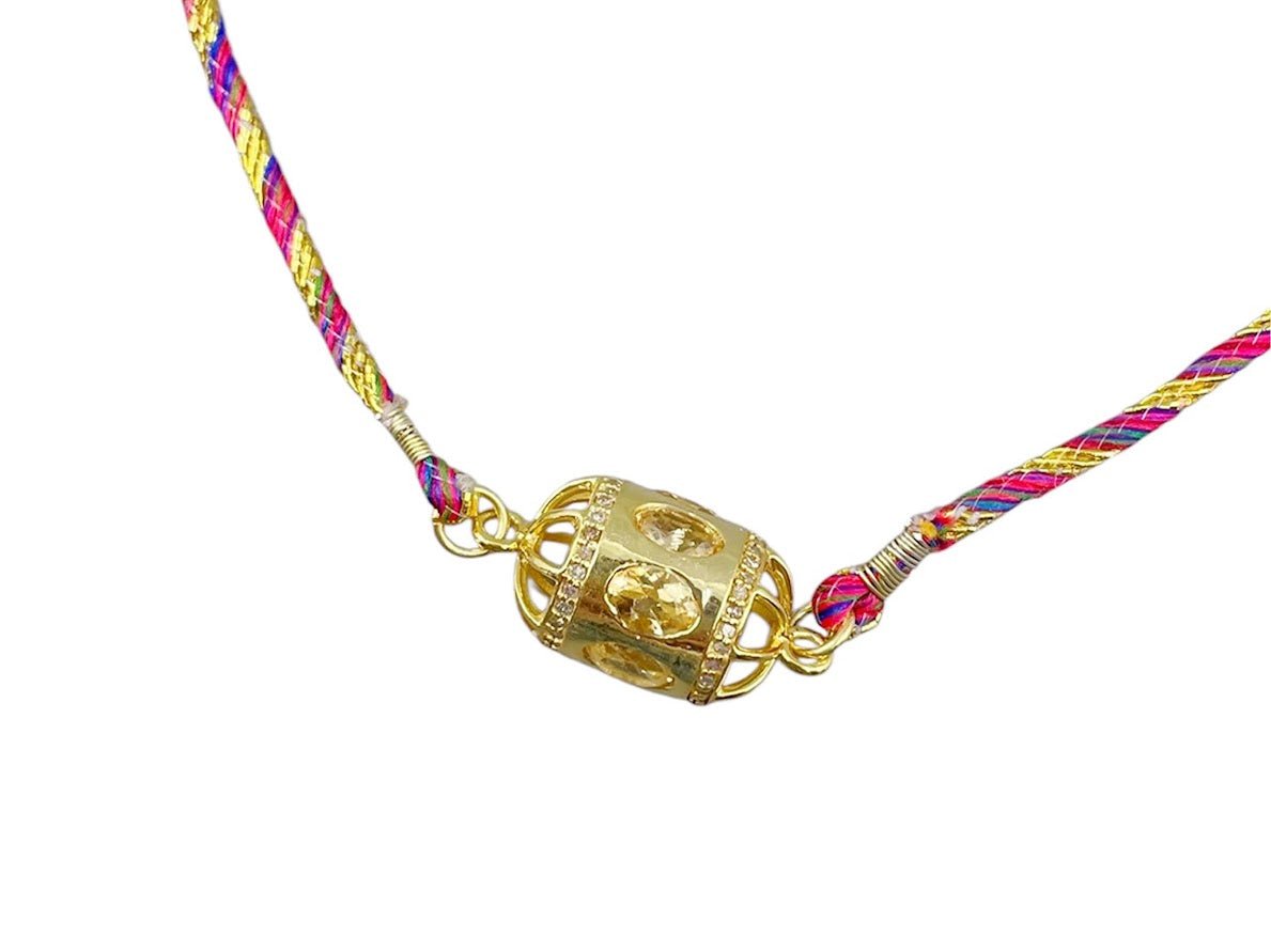 A gold-plated cylinder charm with citrine and diamonds hangs from a woven red and gold cord that measures 19cm plus a 5cm extension. Charm measures 1.8cm wide. Made in France.