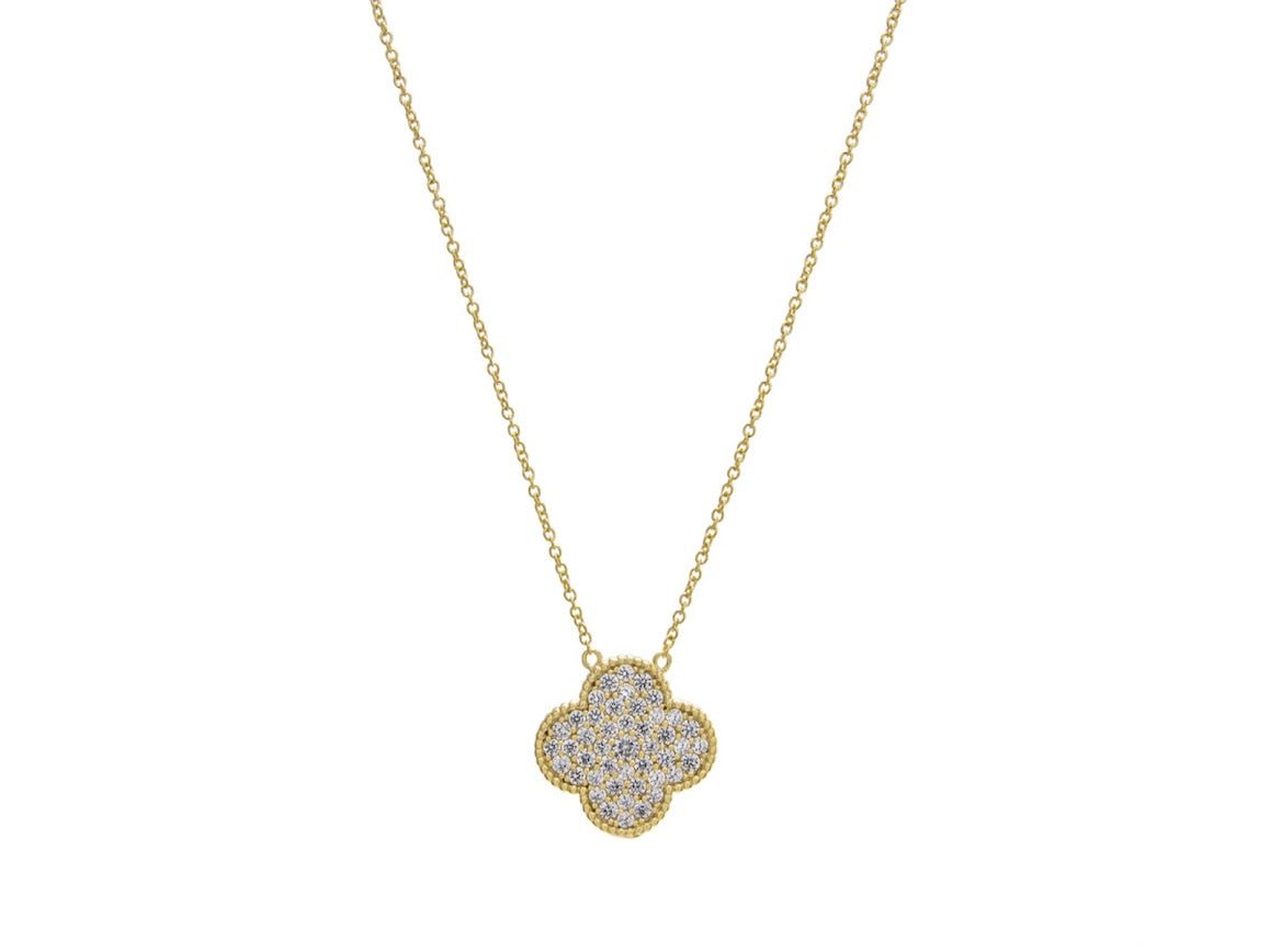 A gold vermeil necklace with a pave cubic zirconia encrusted clover pendant. Nickel free. Chain is 16"to 18". The clover is 3/4"' high and 3/4" wide.