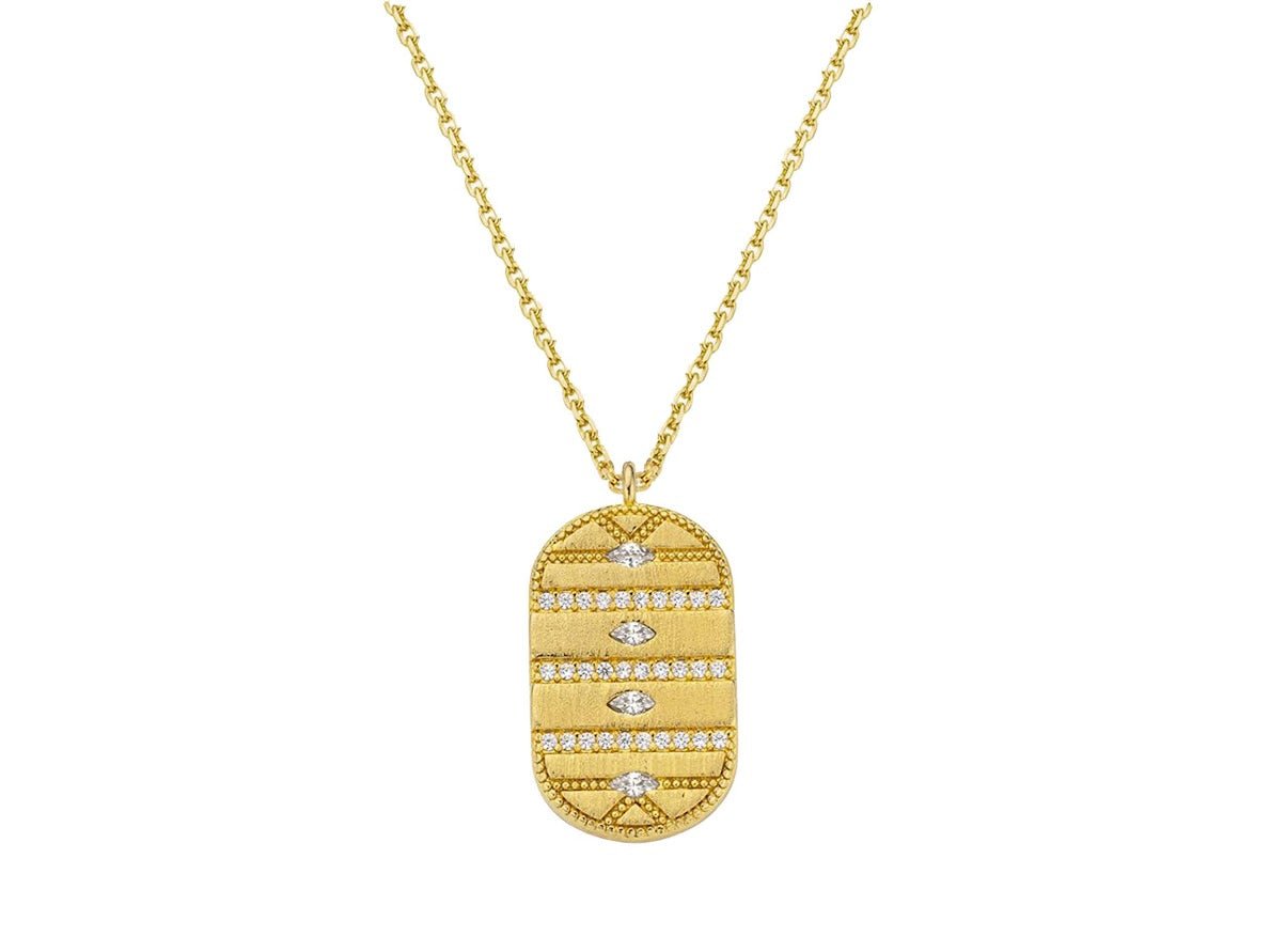 From Belgium: Made of 18k gold-plated brass, plated again with 24k gold, this dog tag pendant is detailed with four cubic zirconia evil eyes. Chain is adjustable from 45 to 53cm.