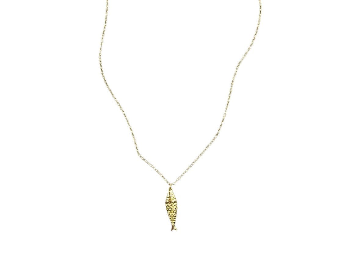 A gold-plated fish pendant with a sparkling cubic zirconia eye hangs from a 14k gold-filled chain that's 18 inches long. Fish symbolize abundance, prosperity, and good luck.