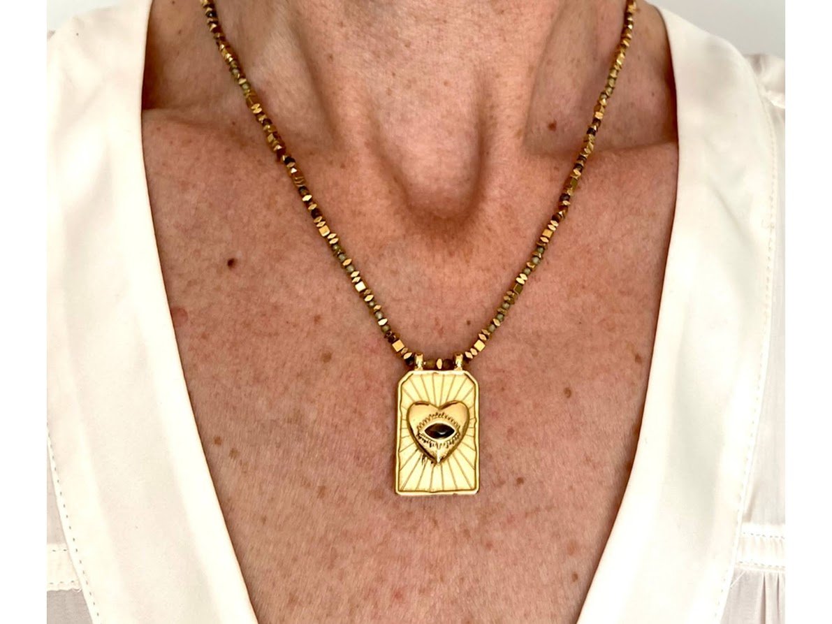 A charm made of 18k gold over stainless steel features a rayed heart with an evil eye on a necklace of tigers eye and gold beads. On the back: "LUCKY." Adjustable from 16 to 18 inches.