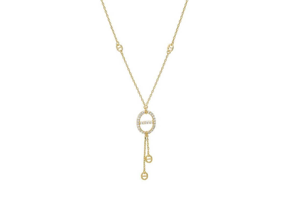 This gold-plated lariat necklace features a mariner link charm that's detailed with cubic zirconia and two small mariner link drops. Adjustable from 16 to 18 inches. Charm measures 15mm. Lobster clasp closure.