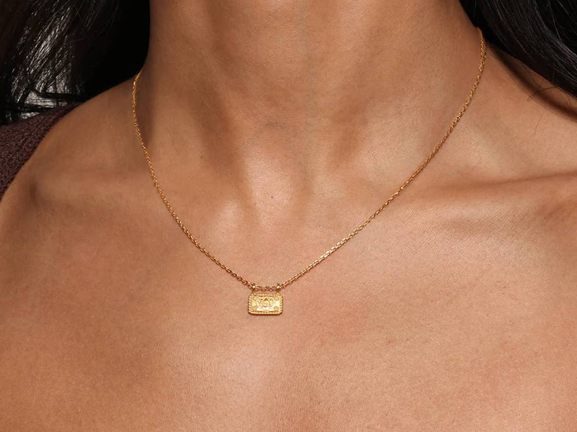 An intricate lotus flower is engraved upon a delicate rectangular charm, symbolizing new beginnings and full potential. Necklace is made of 18 gold plated over brass and measures 16 inches long.