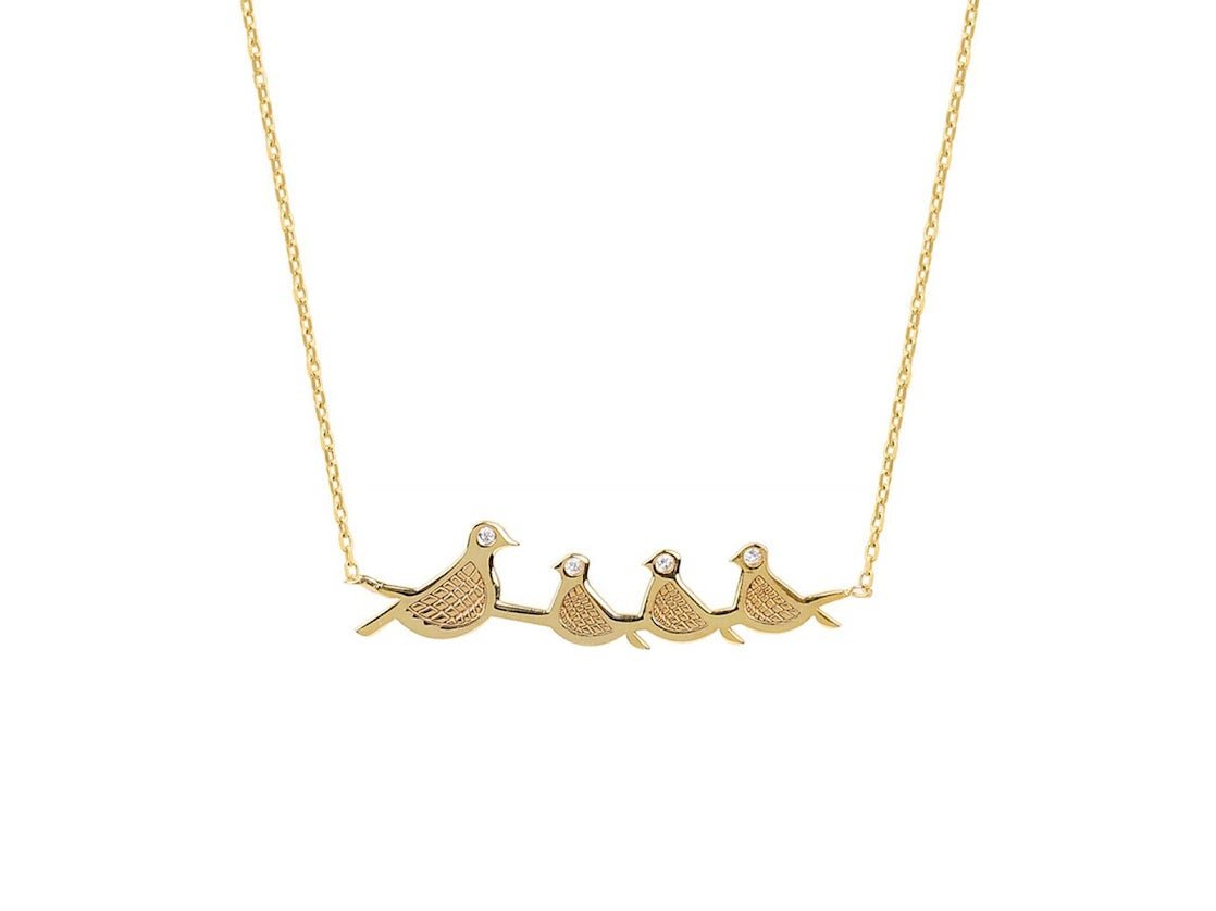 Hold your babies tight before they leave the nest. Inspired by the love shared between mama birds and their baby birdies, this necklace is to be cherished. Give mom a symbolic jewelry gift she'll forever treasure. A gold vermeil necklace with one mama and three baby birds. Etched wings and cubic zirconia eyes. 16 to 18 inches long. Nickel free.