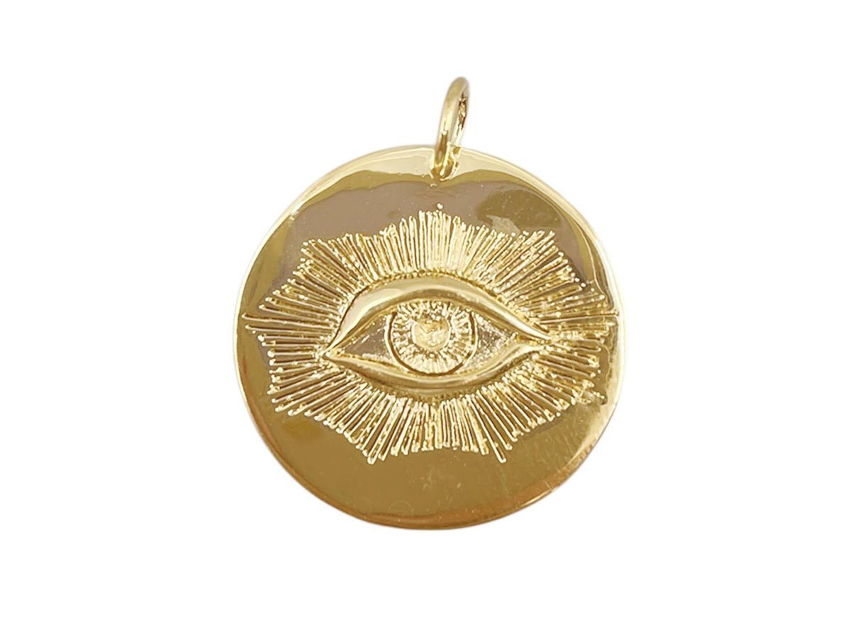 From France: An 18k gold-plated charm with a stamped design of an evil eye surrounded by rays.