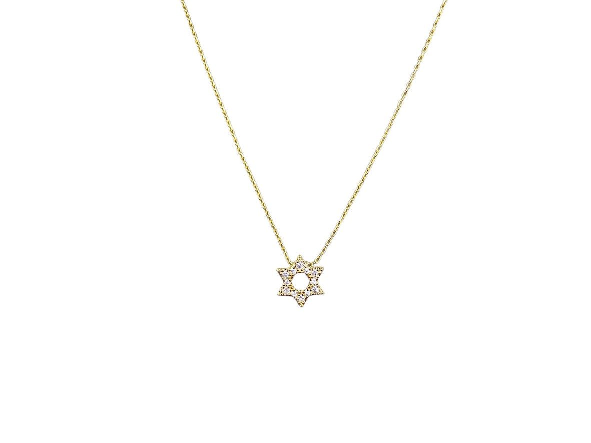 A gold-dipped CZ Star of David necklace made of brass and dipped in yellow gold. 16 inches long.