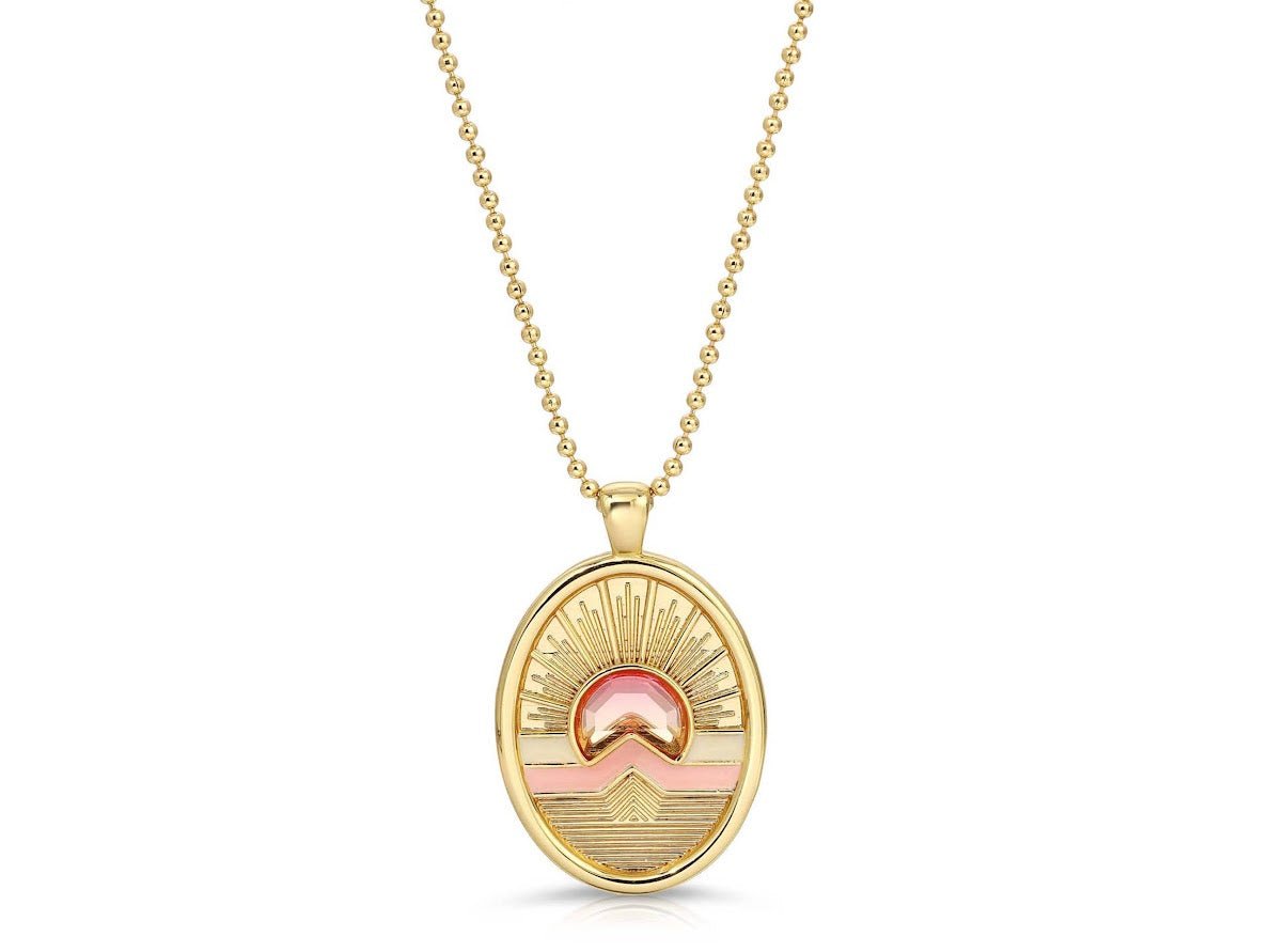 A 14k gold-plated necklace with a textured oval charm with colorful enamel and hand-cut and died natural crystal quartz stone. Charm measures 22mm by 28mm. Ball chain is 16 inches long with a 2-inch extender.