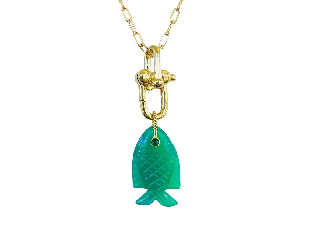 A green fish charm with an inset eye hangs from a 14k gold-filled paperclip chain that's 17 inches long. Carabiner clip can open to add other charms.