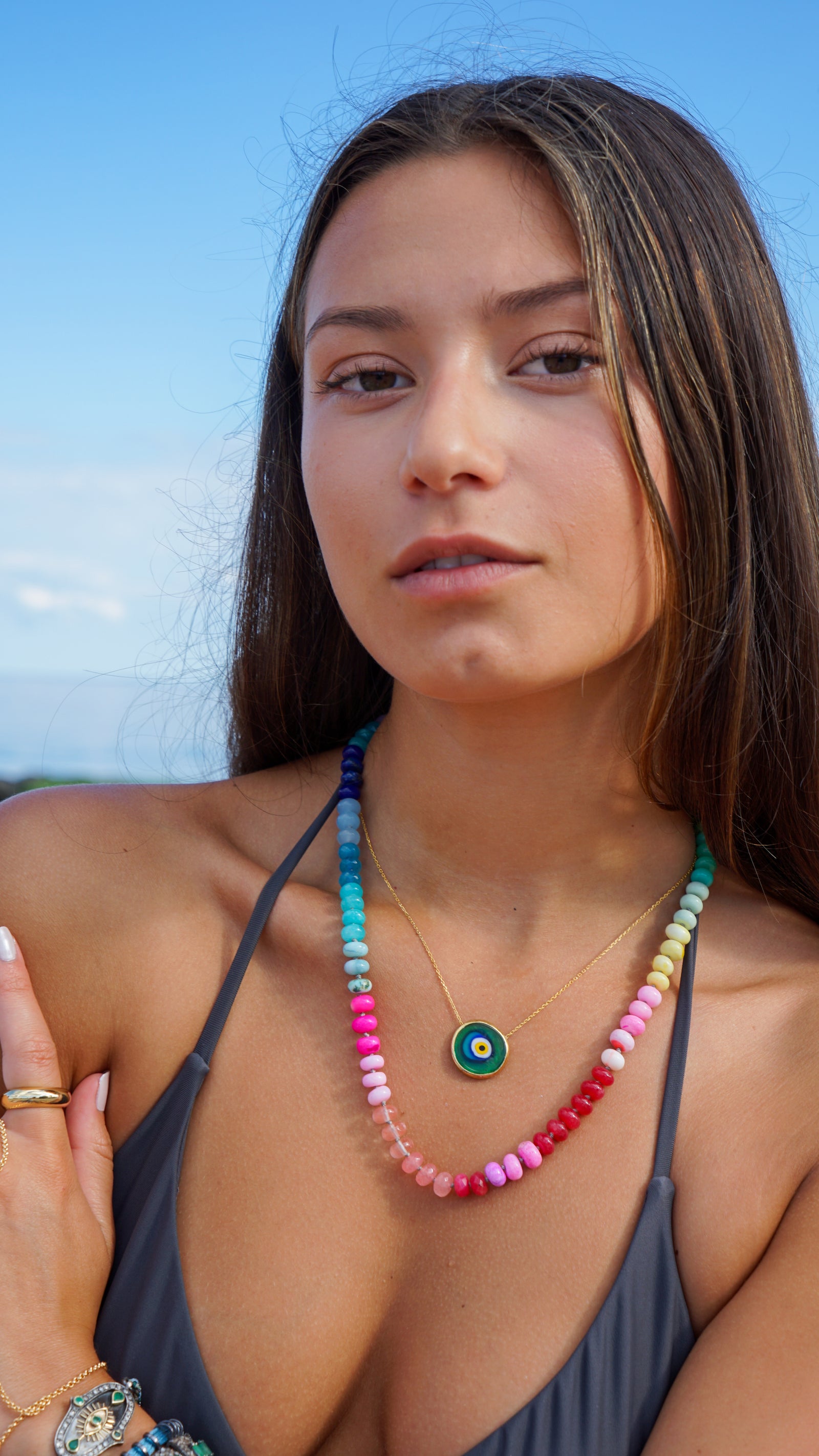 This 14k gold vermeil necklace features a handmade and painted evil eye charm in emerald green, indigo, and warm amber. Charm measures .5 inch. Chain is adjustable from 16 to 18 inches.
