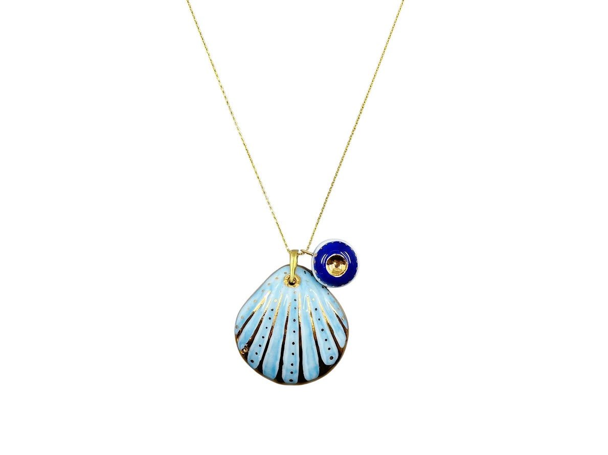 Made of Italian ultra white porcelain, this shell charm, plus a tiny abstract evil eye charm, is handpainted, fired three times, and glazed. Detailed with 22k gold luster. Made in Turkey.