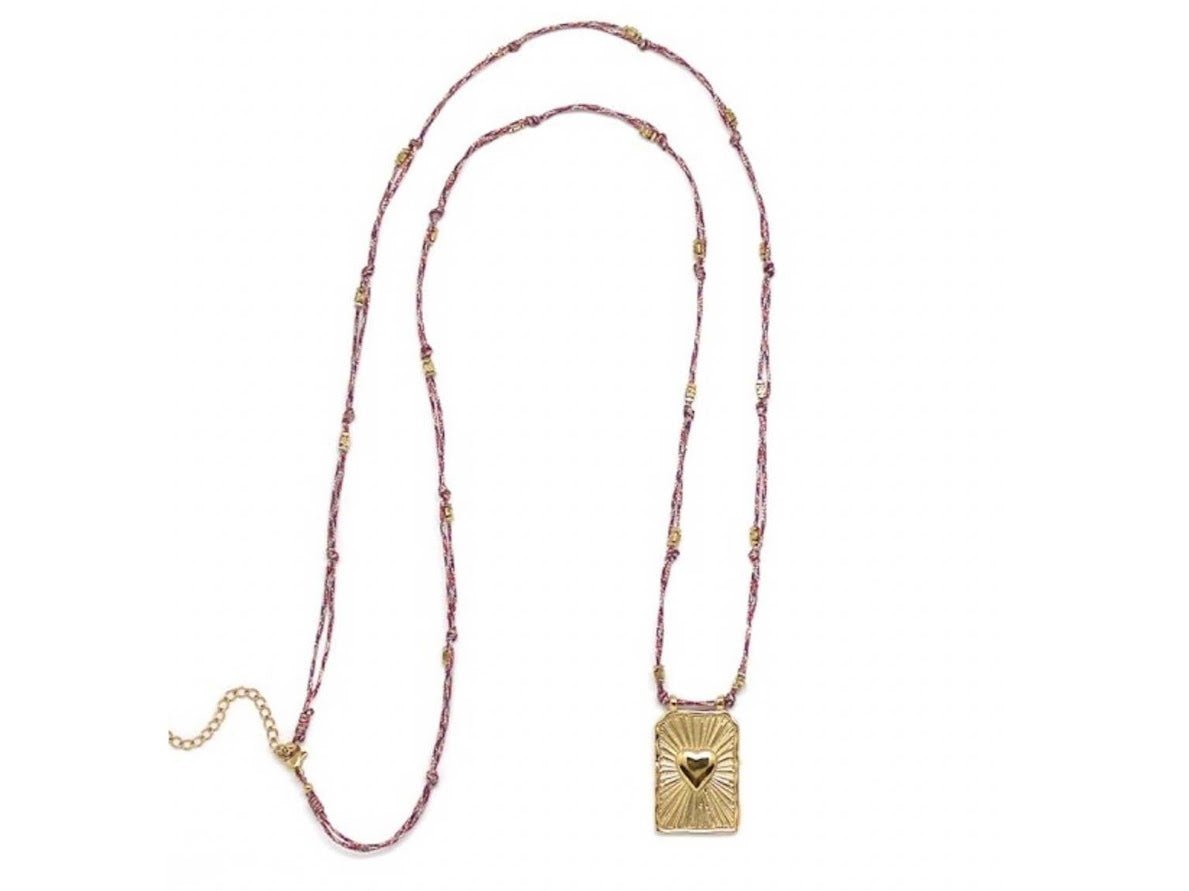 A woven pink cord hosts a gold-plated rayed heart medallion.