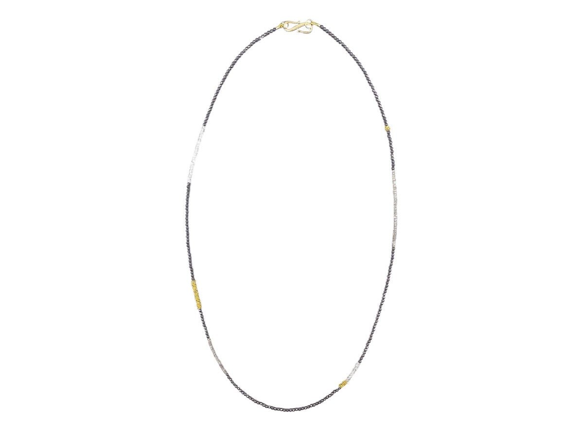 Great alone or stacked, this strand of hematite, labradorite, and moonstone beads features 14k gold vermeil detailing and toggle closure. 23 inches long.