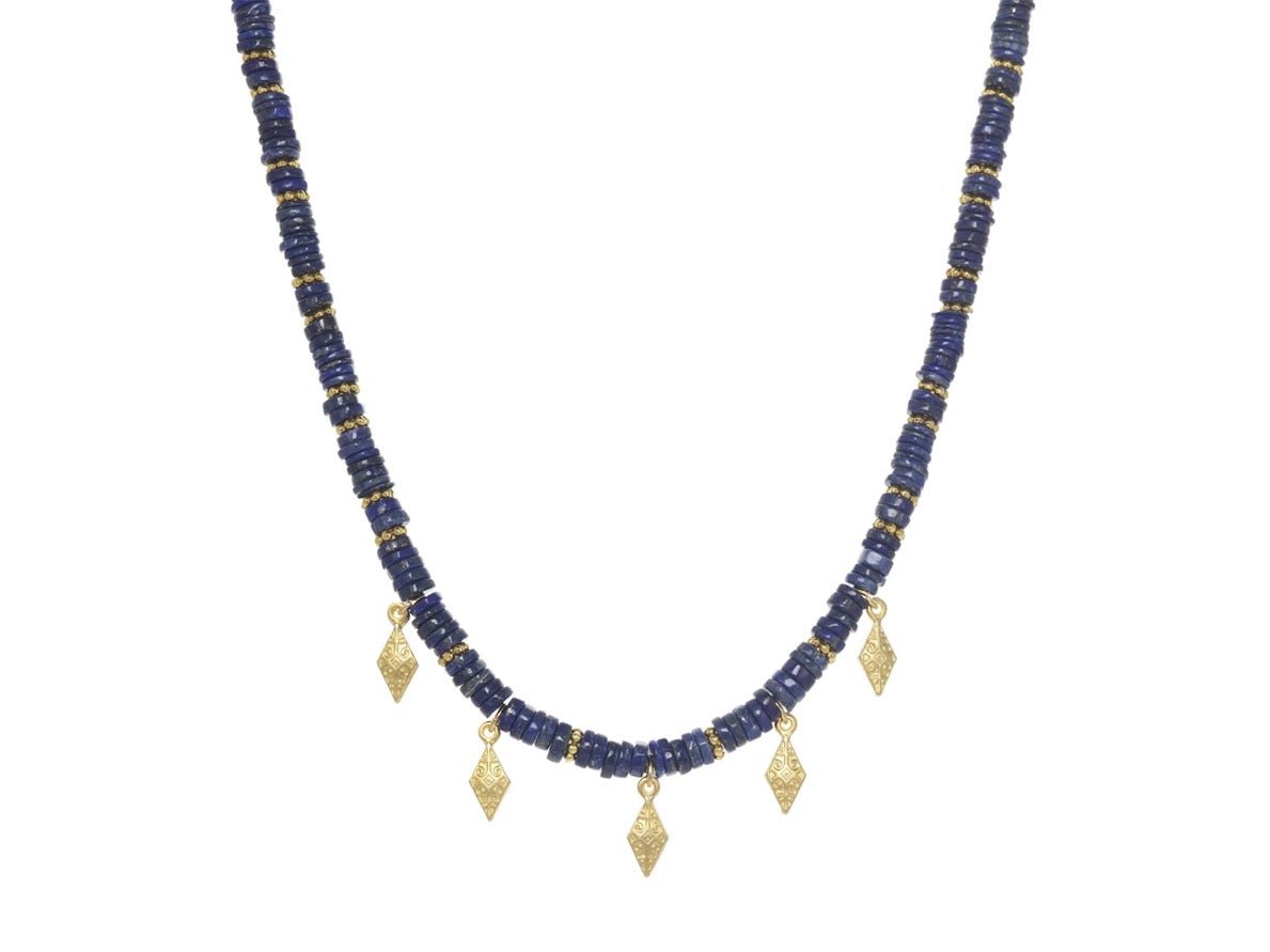 A strand of lapis heishi stones and gold spacer beads features five 24k gold-plated filagree drops that measure .75 inch. Necklace is adjustable from 16 to 18 inches.