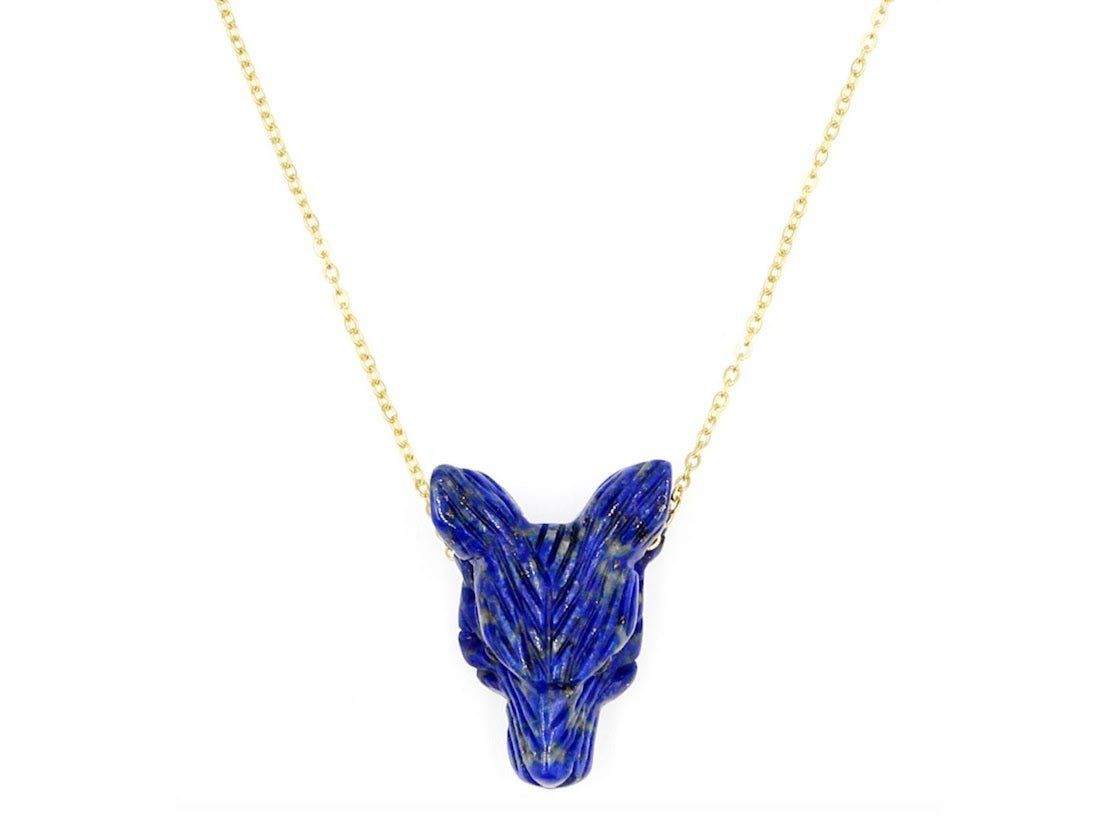 A carved lapis wolf charm hangs from an 18k gold vermeil chain that's adjustable from 44cm to 49cm. The power of the wolf refers to the appetite for freedom and the importance of social bonds. It is also a symbol of the power of intuition and instinct. The wolf measures 22mm. Made in France.