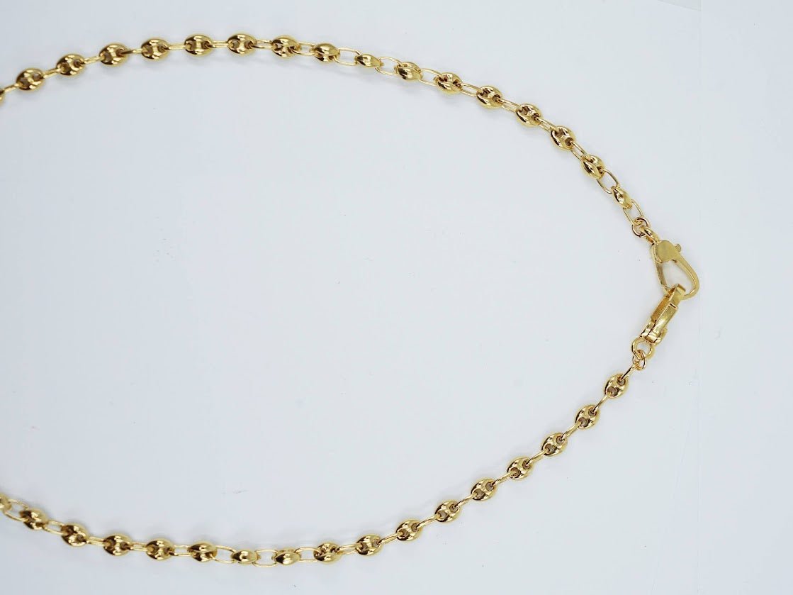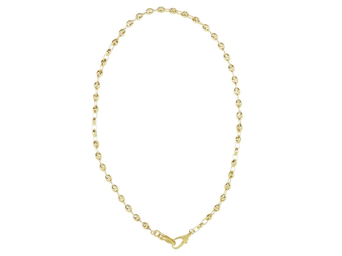 A 14k gold vermeil mini puffy mariner link chain with a love lock closure made of two identical locks joining together in an embrace. 17 inches long.
