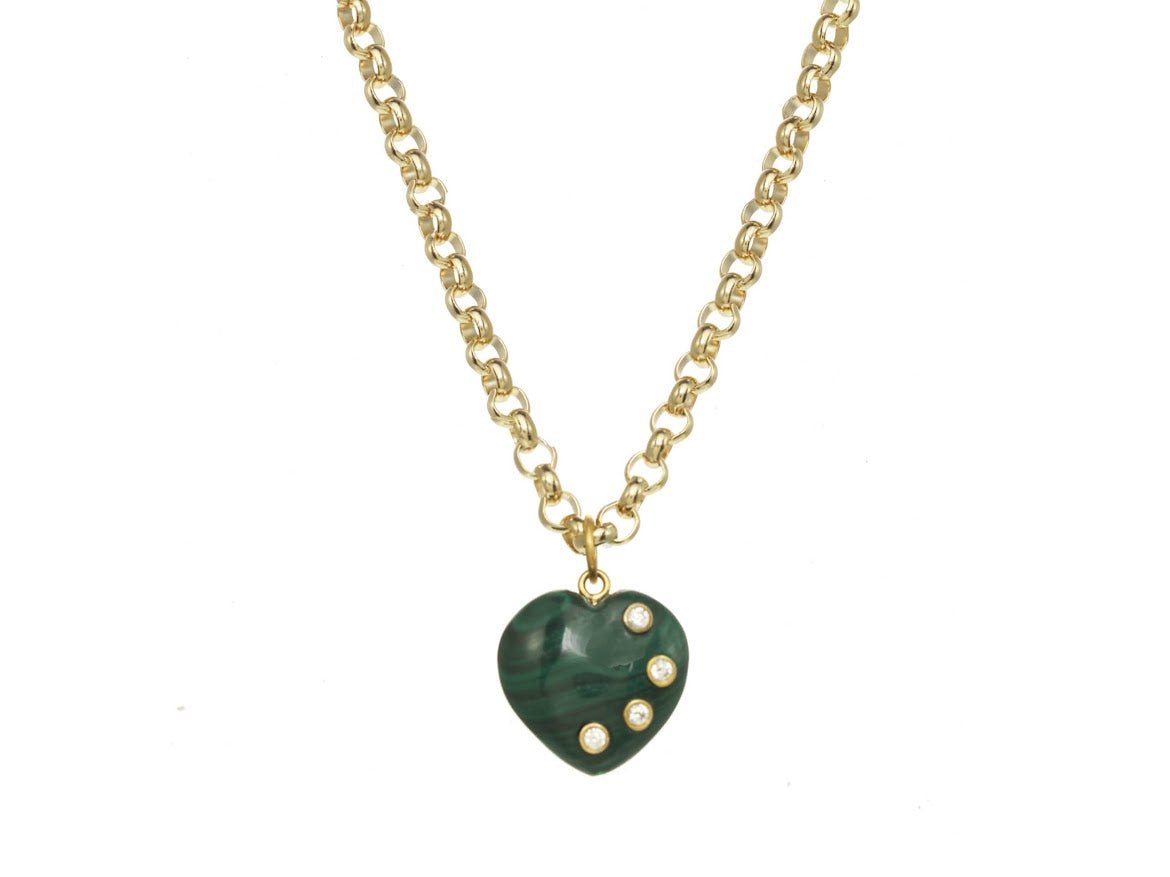 A 14k gold vermeil, malachite, and cubic zirconia heart charm hangs from a 14k gold-plated rolo chain that's adjustable from 16 to 18 inches. Charm is 1 inch long.