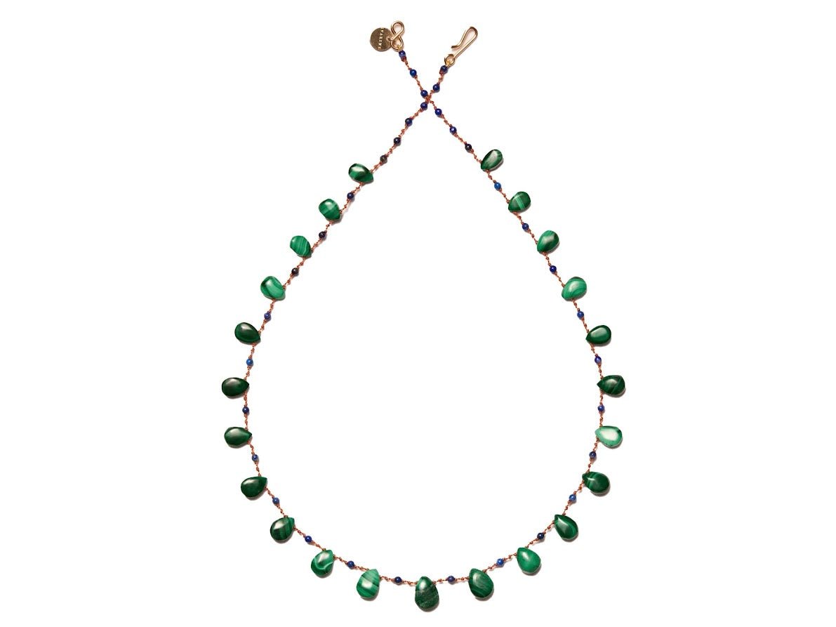 Malachite droplets are strung on a silky nylon cord with smaller lapis stones between and a 14k gold-filled hook clasp. 17.3 inches long.