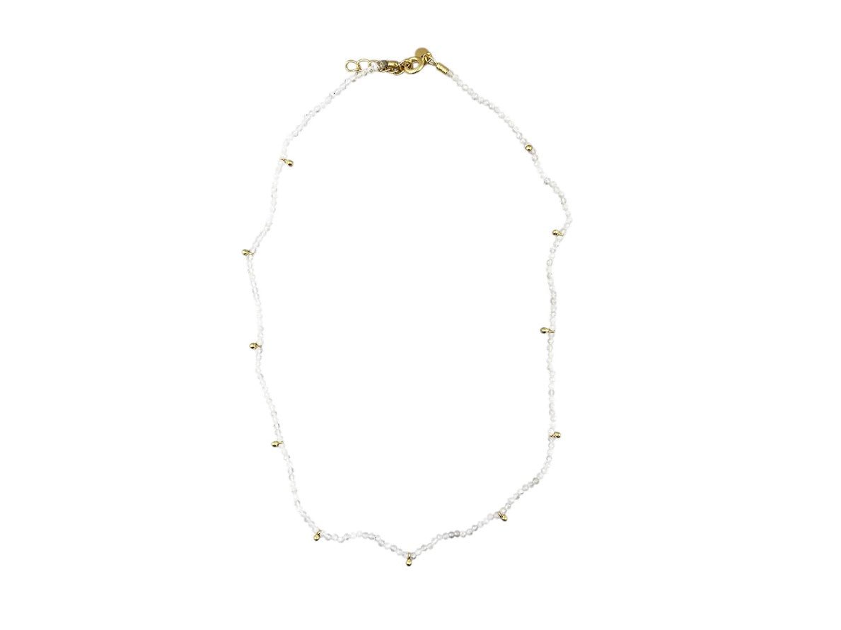 This necklace is composed of mini white labradorite beads with 9 small gold-plated pendants. 40cm long with a 2cc remainder chain.