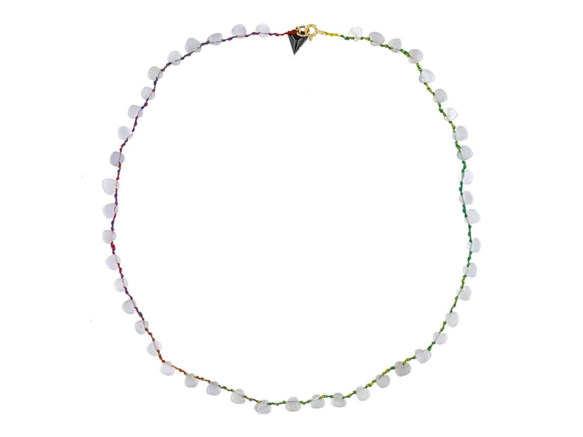 Moonstone hearts are knotted on tan cord in a necklace of 41cm. 18k gold vermeil components. Made in France.