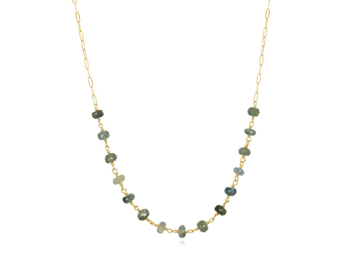 A 14k gold vermeil paperclip chain is hand-wrapped with moss aquamarine stones. Perfect solo or layered. Adjusts from 16 to 18 inches long.
