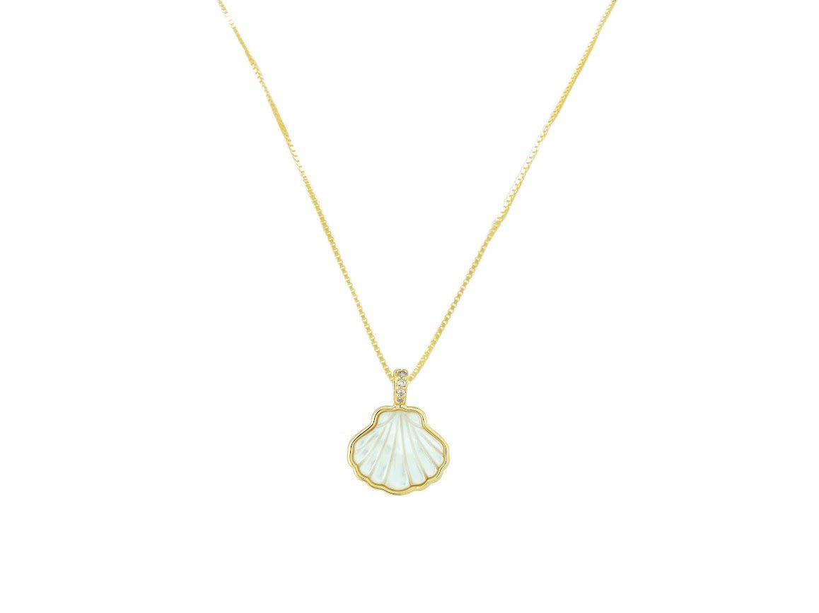 A gold-dipped scallop charm with mother of pearl and a pave cubic zirconia bail hangs from a gold vermeil box chain that's adjustable from 16 to 18 inches.