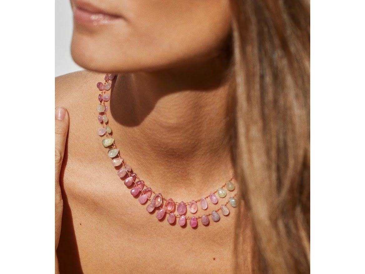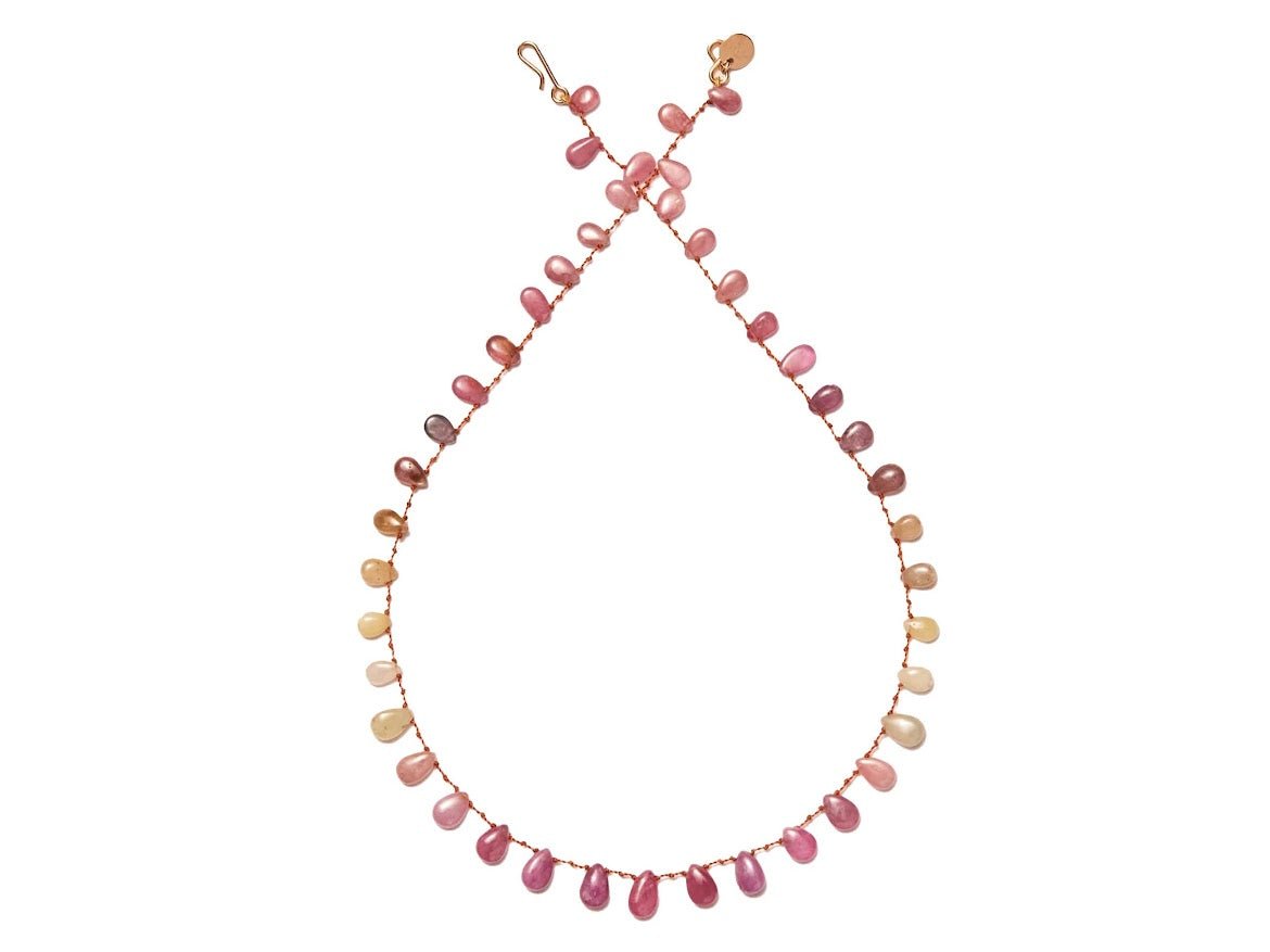 A stunning necklace of 48cts of multicolor sapphire droplets, each separated by three knots on a silky cord. Sapphires measure from 6 by 4mm to 9 by 5cm. Closes with a 14k gold-filled "infinity" clasp. 45cm long.