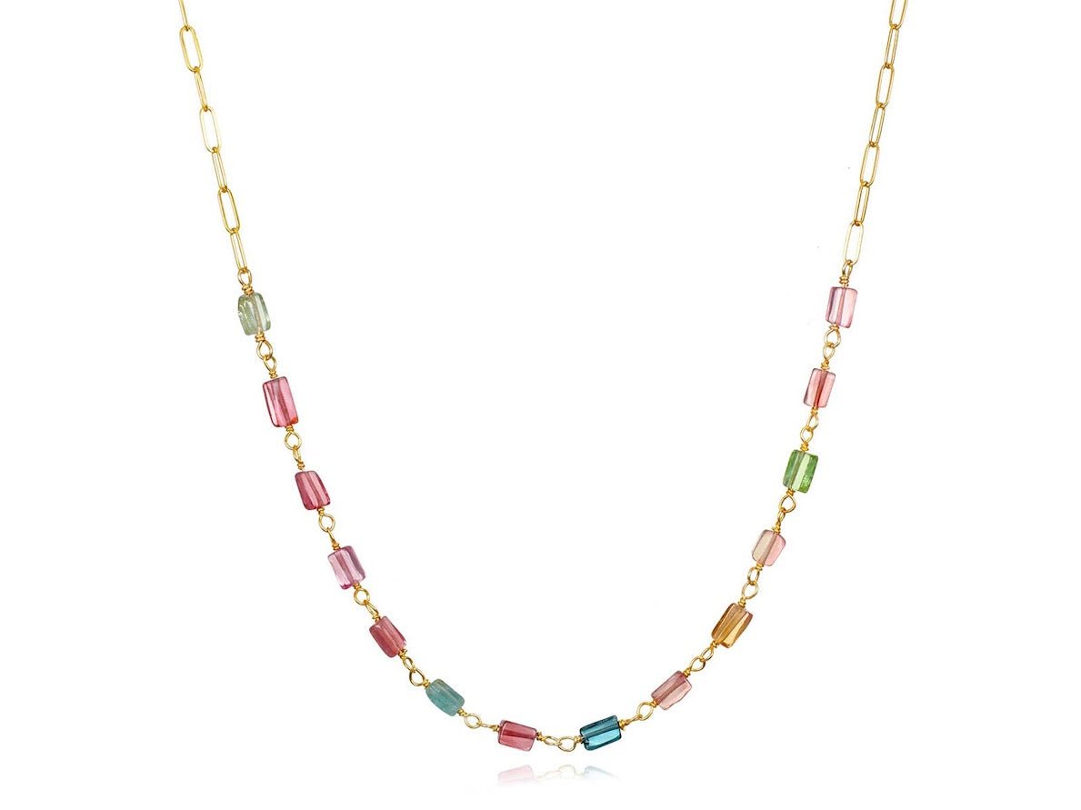Multicolored tourmaline chicklets are hand-wrapped in 14k gold vermeil on a 14k gold-filled paperclip chain that's adjustable from 16 to 18 inches.