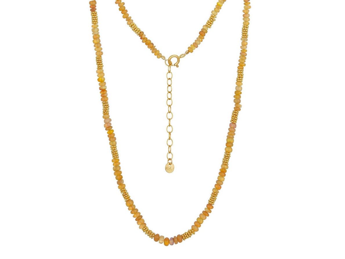 Opal beads measuring 3 to 4mm are strung with gold-plated daisy beads on a steady silk cord. Adjustable from 16 to 18 inches.