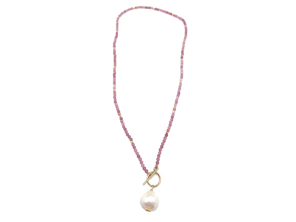 A sweet necklace of pink tourmaline stones, gold beads, and a gold-filled toggle clasp. 17 inches long. Perfect alone or stacked.
