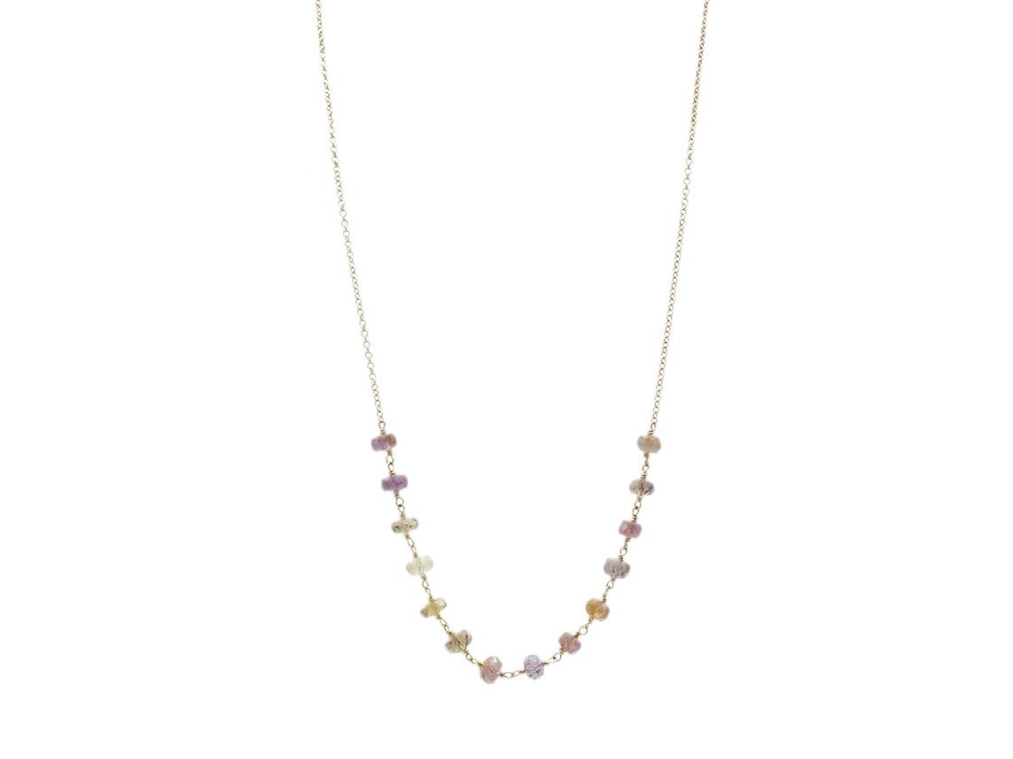 A selection of pink, yellow, and lavender sapphires, hand-wrapped onto a delicate 14k gold-filled chain that's 16 inches long, plus a 2-inch extender, with a delicate lobster clasp.