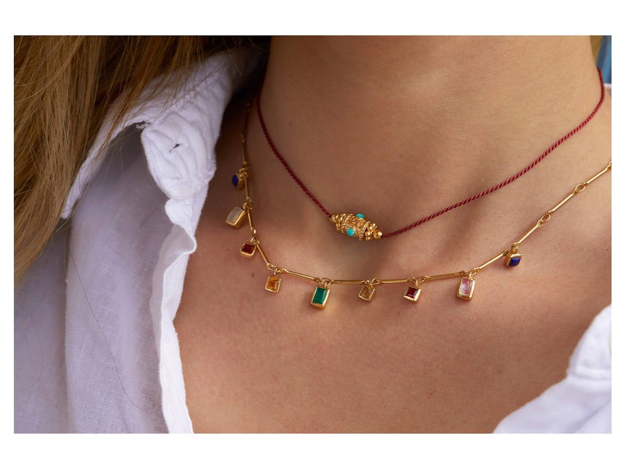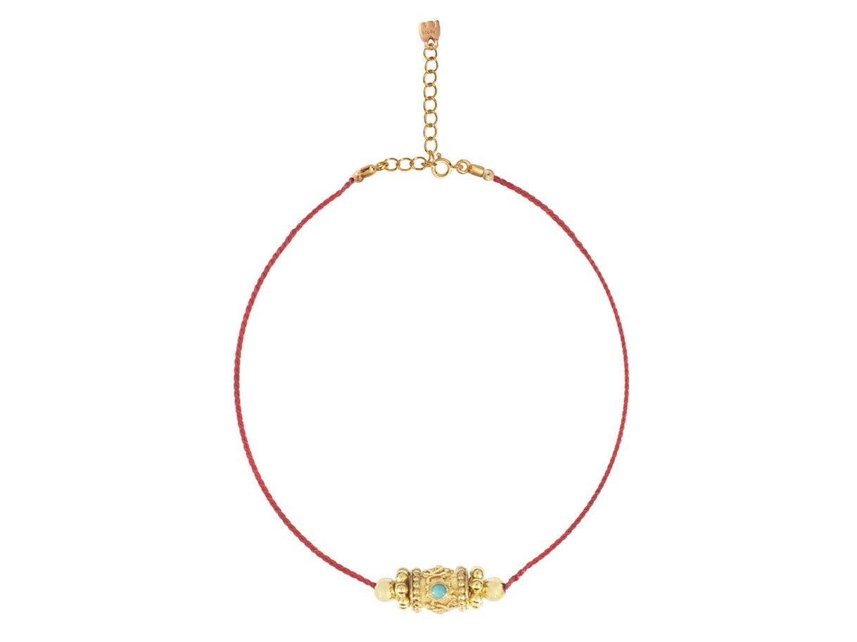 From Dorothee Sausset: A red woven thread choker with a center bead made of 24k gold vermeil and 2mm cabochon turquiose stones. Adjustable from 35mm to 38.5mm.