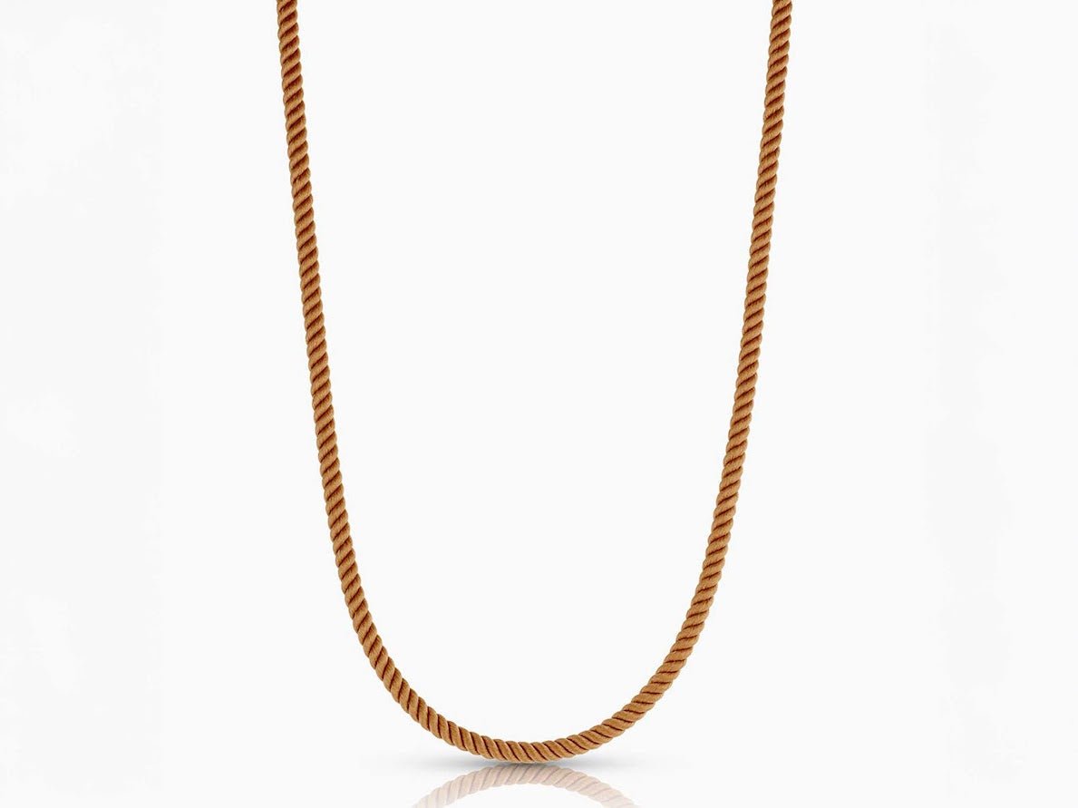 A cord necklace of sand silk that's perfect alone, stacked, or holding your favorite charms. 14k gold plated. Adjustable from 15" to 17".