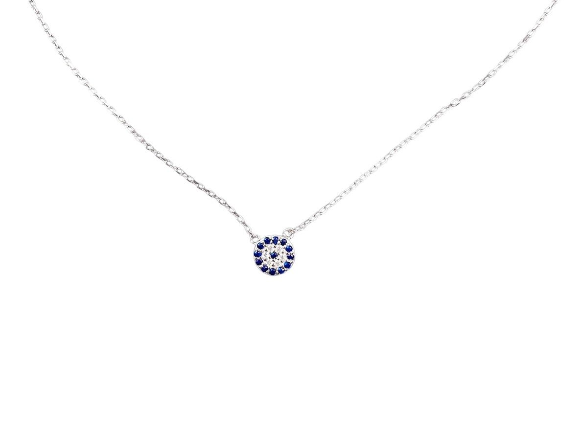 This sterling silver necklace features a tiny charm of blue and white cubic zirconia. 15 inches long.