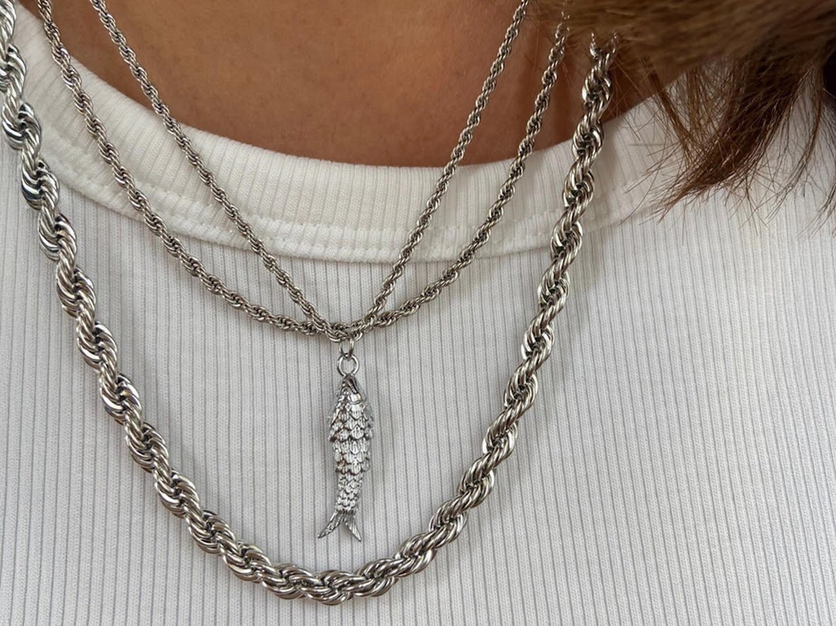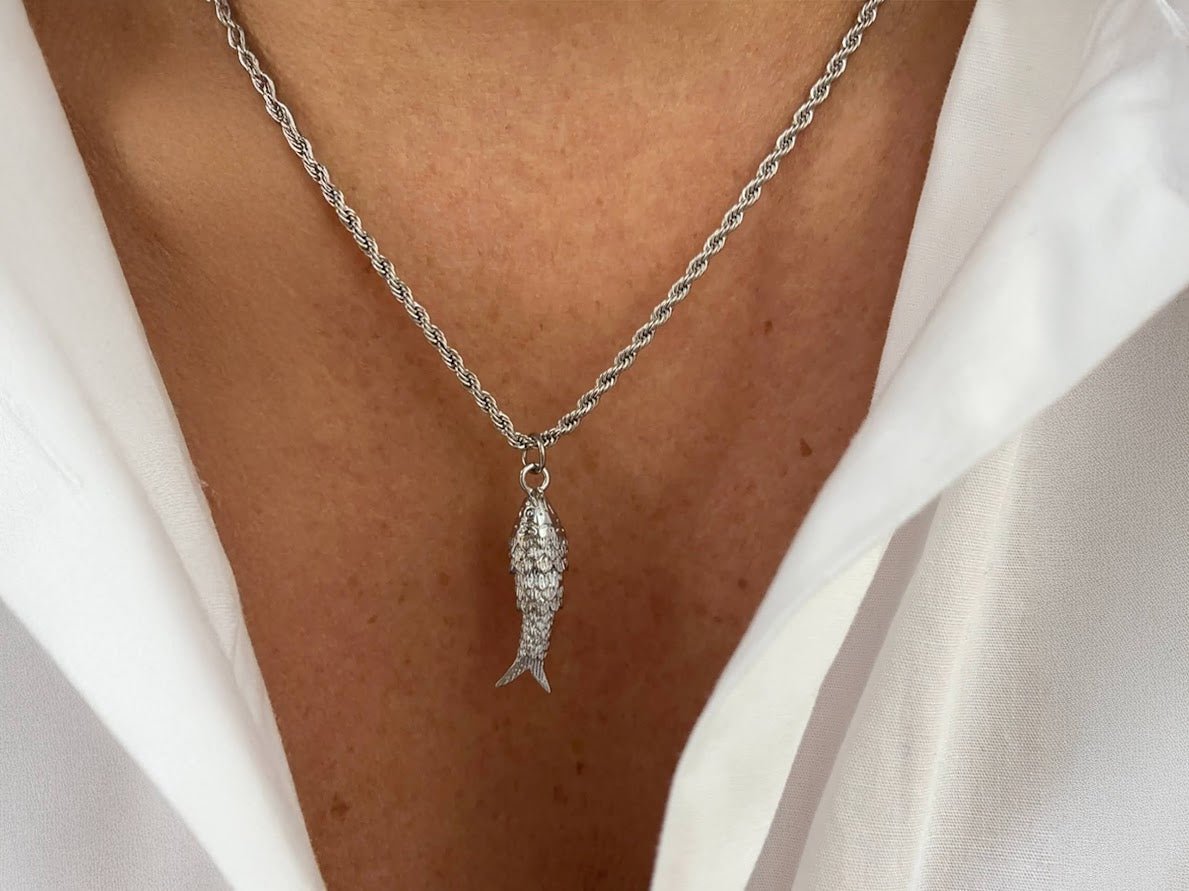 Made of silver plated over stainless steel, this necklace features a small fish charm on a rope chain that's 16" with a 2" extension chain. Fish symbolize abundance, prosperity, and good luck.