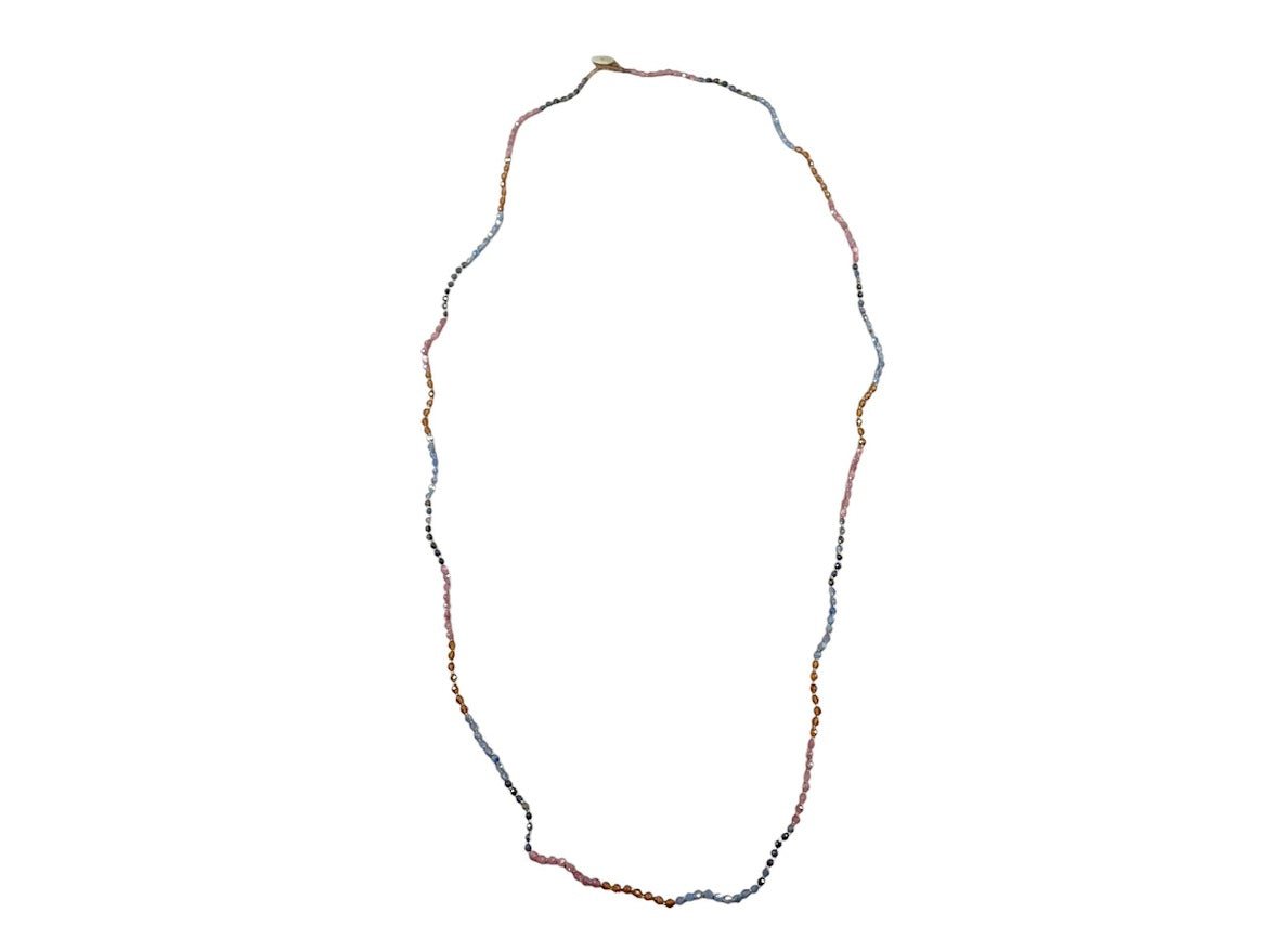 A 30-inch strand of tiny pink tourmaline, garnet, and kyanite beads with a button closure, closure makes its easy to add charms.