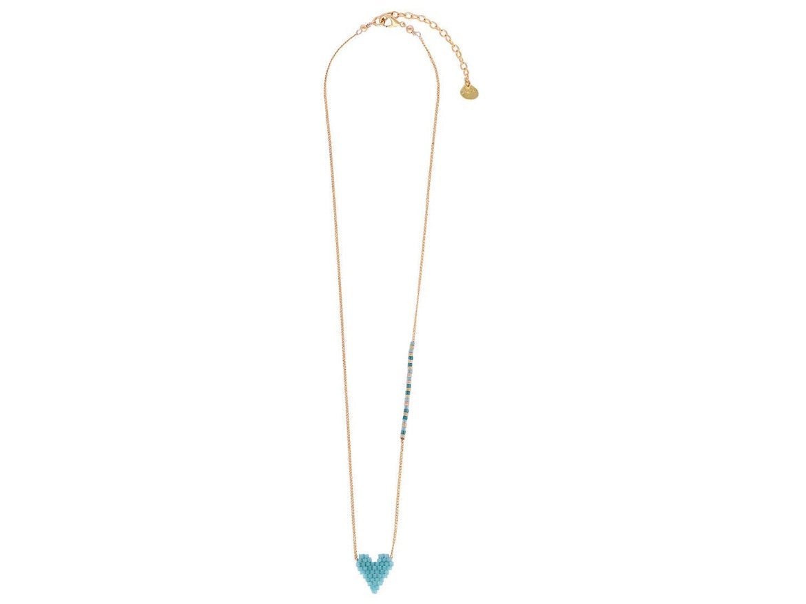 A turquoise beaded heart hangs from an 18k gold-plated chain with beaded detailing on one side. 17" to 19" long.