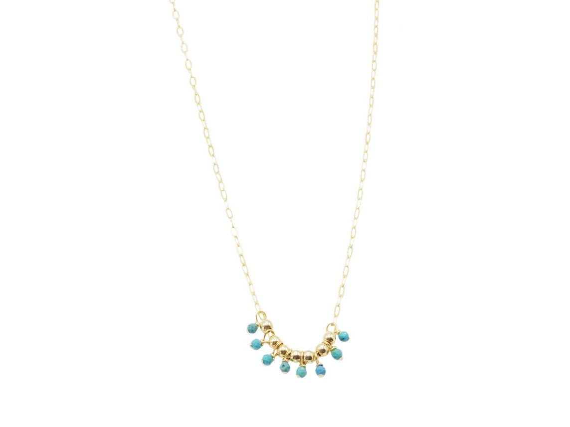 A 16-inch gold-filled chain with gold beads and turquoise fringe. Nickel free.