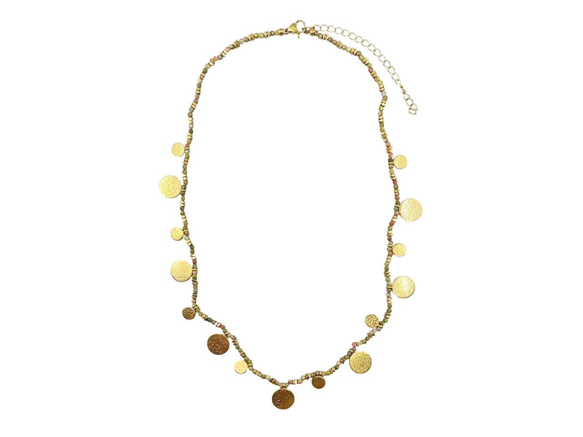A strand of unakite features large and small discs of 18k gold-plated stainless steel. Unakite is associated with the heart chakra as well as harmony and grounding. 16 inches long with a 2.5-inch extender.