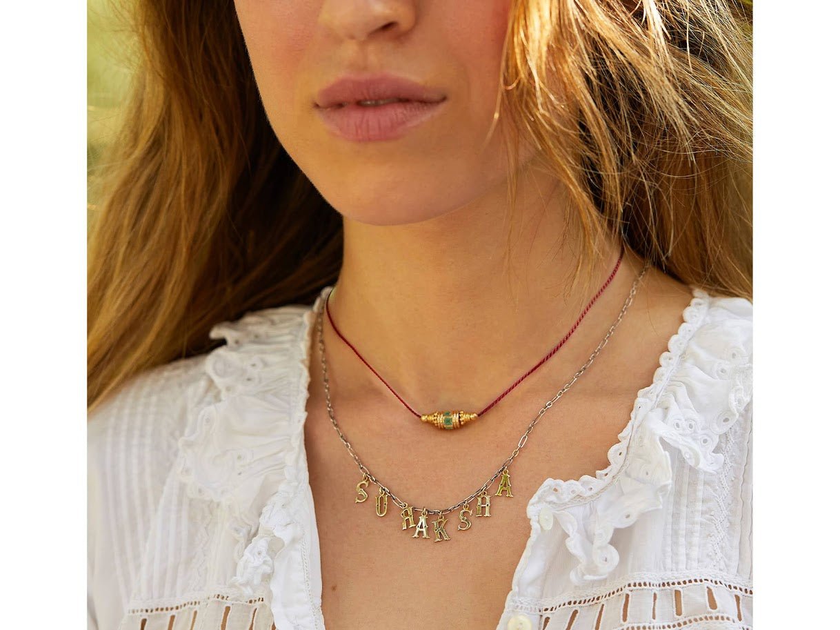 From Dorothee Sausset: A woven red thread choker with a center bead that's made of 24k gold vermeil and 2mm faceted green onyx beads. Adjustable from 35mm to 38.5mm.
