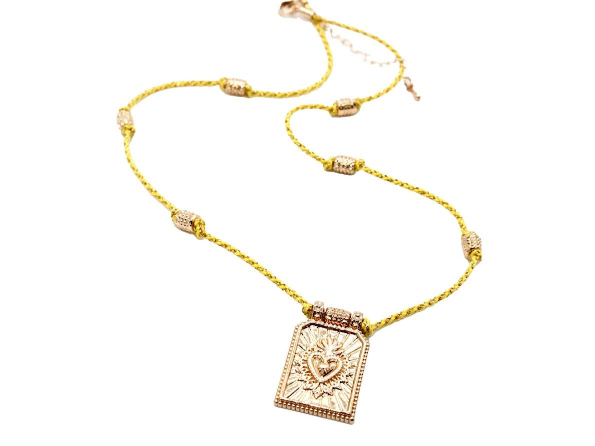 An adjustable woven yellow necklace features a gold-plated enamel heart pendant. Cord is adjustable from 17 to 20 inches.