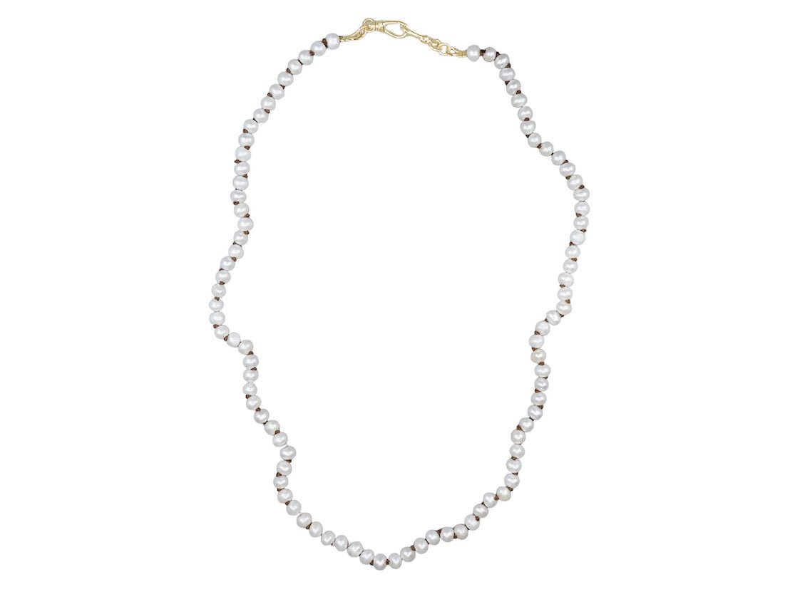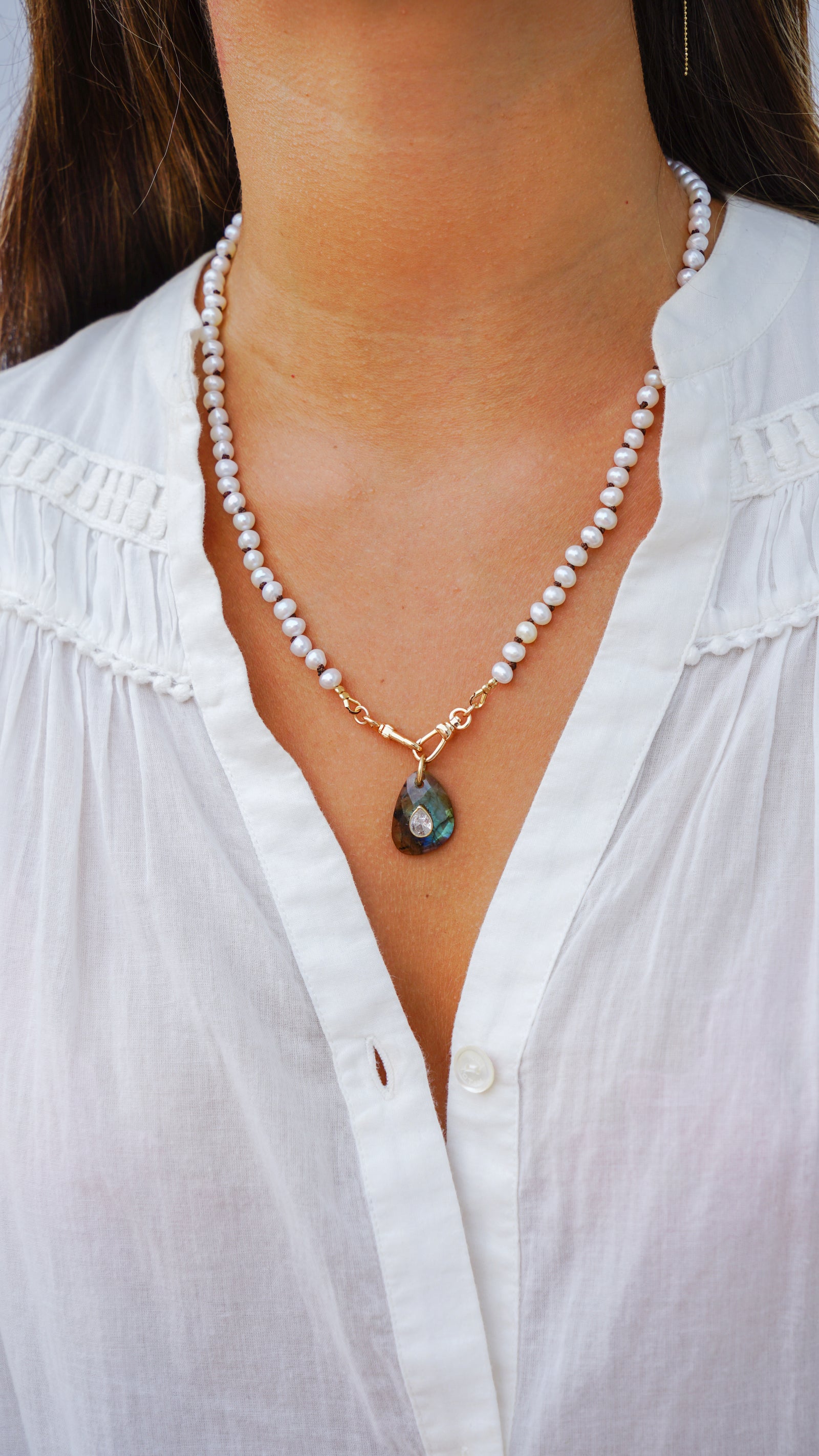 White Pearl Necklace with Green Enamel Evil Eye Pendant