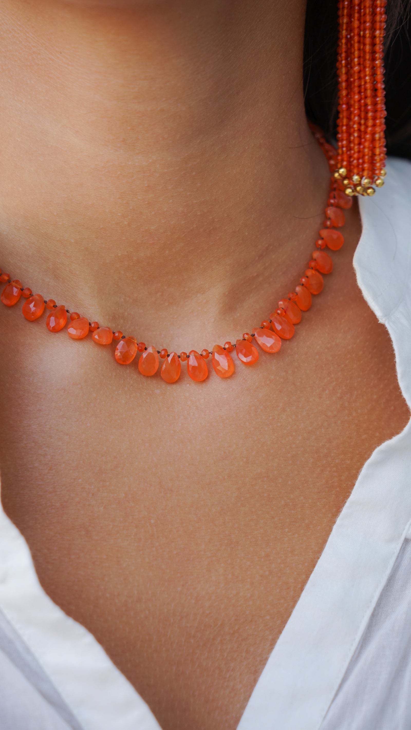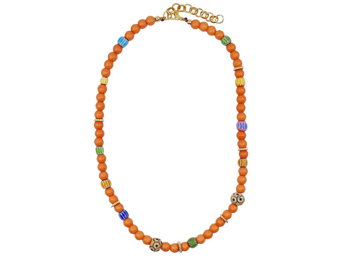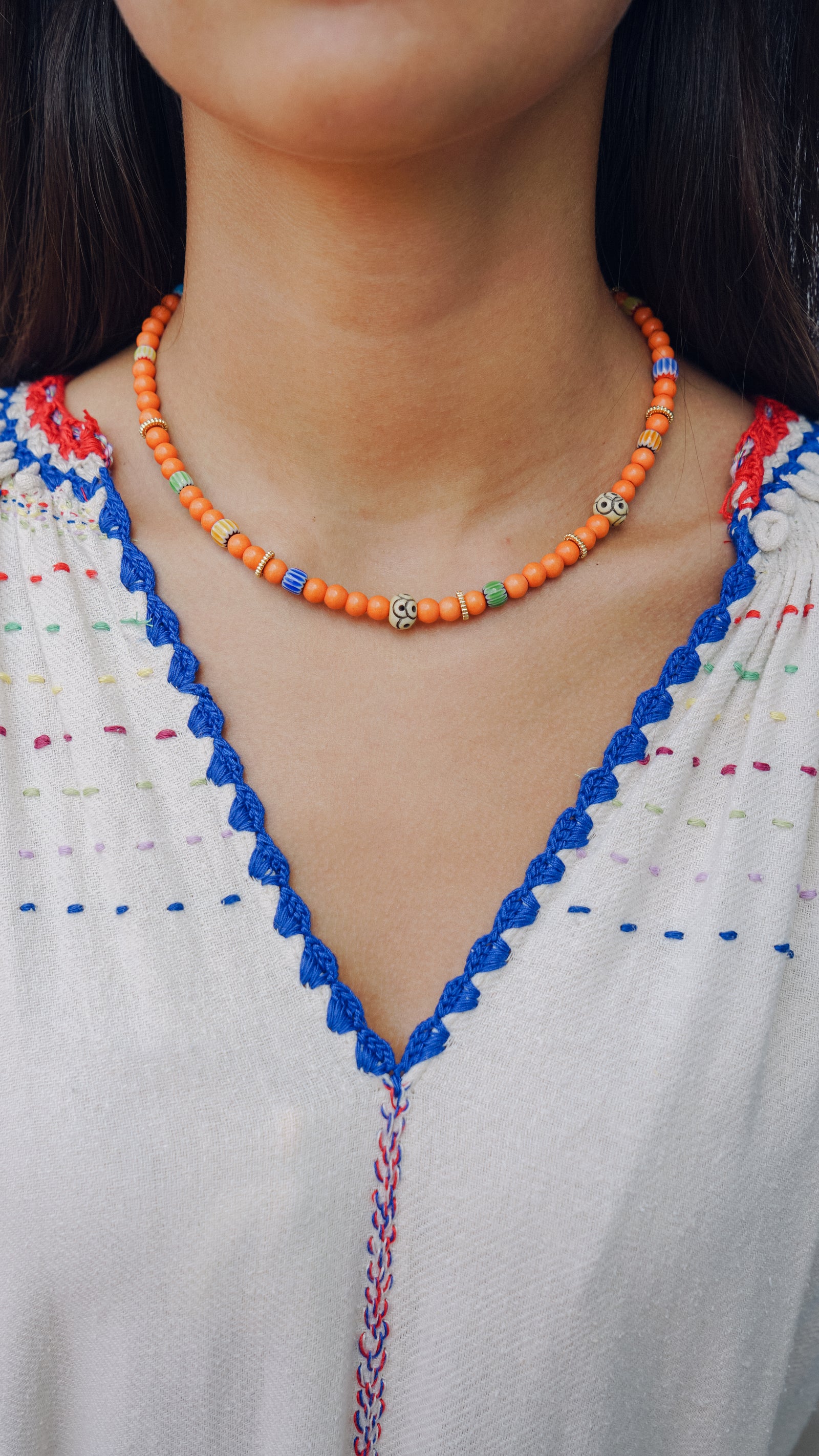 Orange and Gold Woven Necklace with Chalcedony Roller Bead