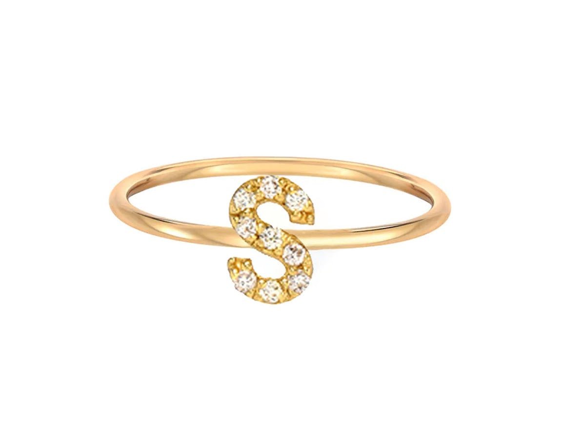 A 14k yellow gold classic band with a single intitial of pave diamonds, approximately 5mm tall. Available in sizes 5, 6, 7, and 8. Please allow three weeks for delivery. Personalized items are FINAL SALE.