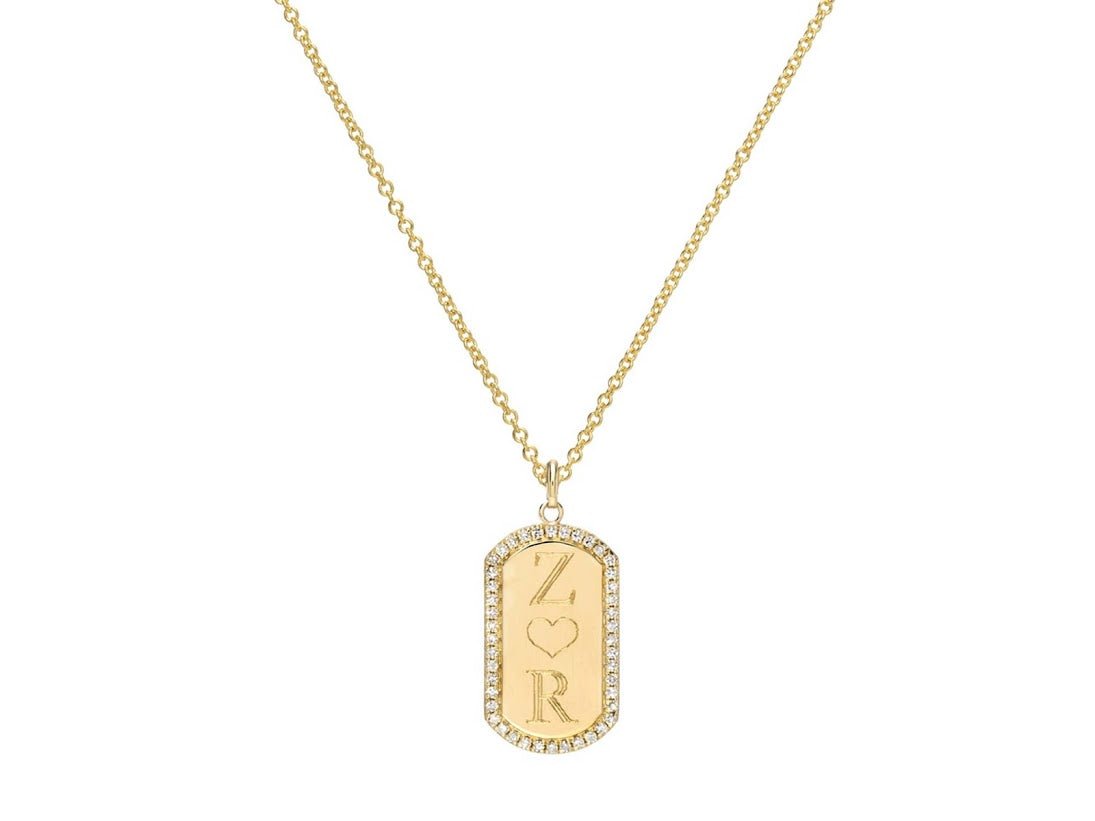 A 14k yellow gold necklace with a mini dog tag pendant outlined with .2 ct of diamonds. This piece can accomodate up to 9 characters in block, script, or gothic lettering that run vertical or horizontal. Dog tag measures 10mm by 15mm. Available in 16", 14"-16", 16"-18", 18", and 20" lengths. Please allow three weeks for delivery. All personalized items are FINAL SALE.