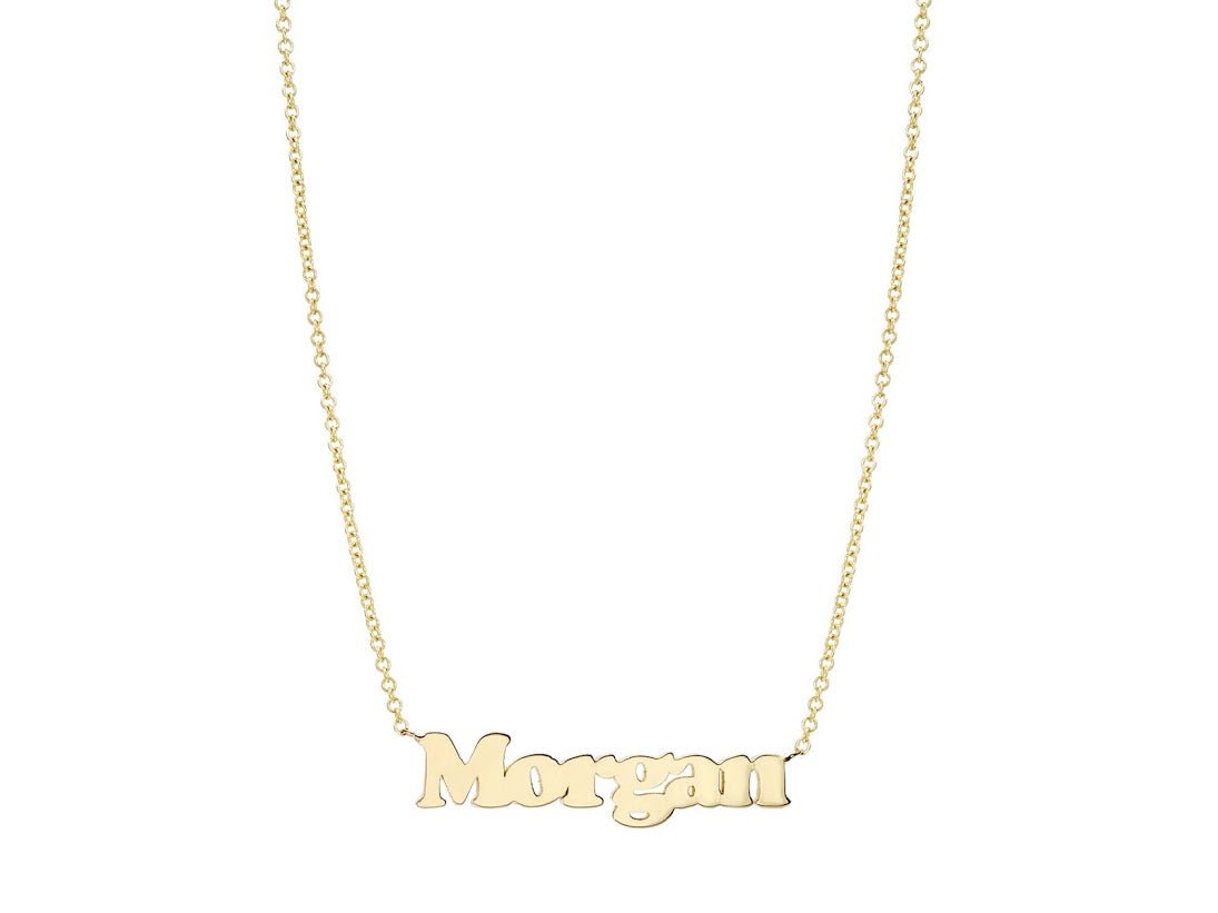 A 14k yellow gold necklace with a name of up to 10 characters in block lettering. Letters are approximately 5mm high. Available in 16", 14"-16", 16"-18", 18", and 20" lengths. Please allow three weeks for delivery. All personalized items are FINAL SALE.