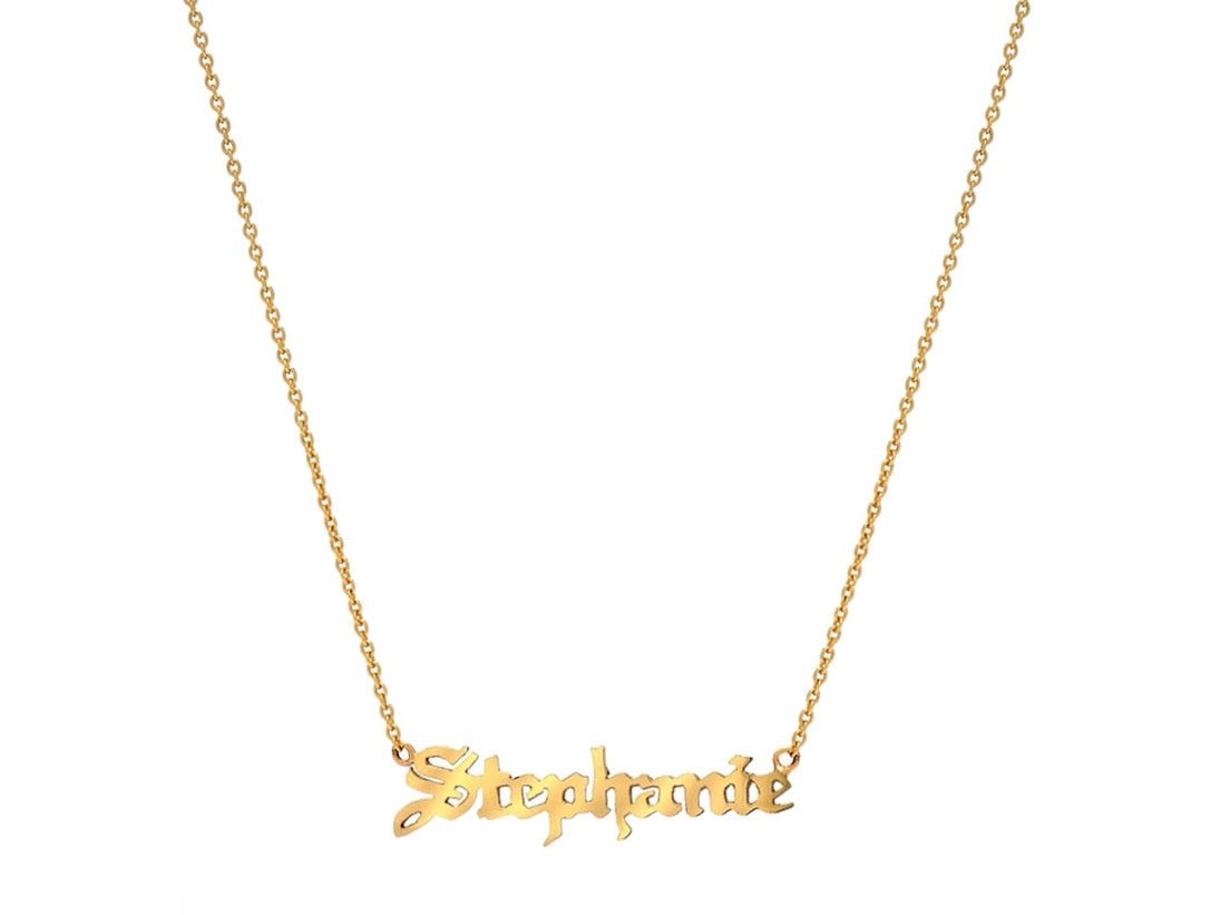 A 14k yellow gold necklace with up to 10 letters of a 8mm height. Available in 16", 14"-16", 16"-18", 18", and 20" lengths. Please allow three weeks for delivery. All personalized items are FINAL SALE.