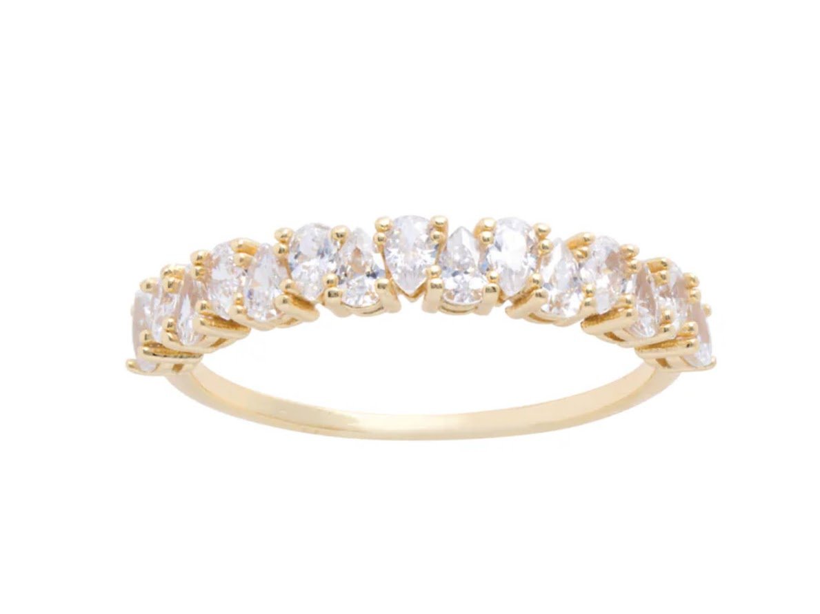This 14k gold vermeil stackable band is detailed with teardrop cubic zirconia and is available in sizes 6, 7, and 8.