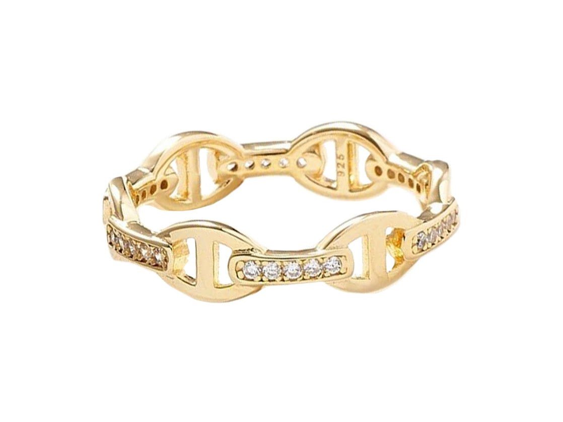 Made of 14k gold vermeil, this ring offers pave-set cubic zirconia on the band with golden links between them. Sizes 5, 6, 7, and 8 available.